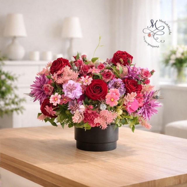 母の日 「プレステージ・サン」鮮烈なダリアとオールドローズの豪華モダンアレンジ アーティフィシャルフラワー