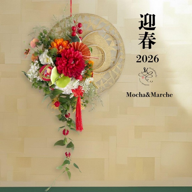 しっとりとした和の美しさの中に、心がぱっと華やぐ特別感を。 こちらは、モカアンドマルシェの中でも“ワンランク上”の仕上がりを楽しめる、赤×ゴールドの華やぎしめ縄リースです。 まず目を惹くのは、模様入りの雅な赤色土台。 まるで和雑貨のように上品で、飾るだけでお正月の空気がふわっと整う特別デザイン。 さらに、アクセントとしてゴールドリーフを贅沢にあしらい、光が当たるたびに優雅な輝きを放ちます。 花々が重なり合い寄り添う花姿は清らかで凛とした印象を与えてくれます。 さらに、縁起物の飾り紐や金の実もの、流れるグリーンのしずくラインが美しく揺れ、迎春ムードをより豊かに彩ります。 飾るだけで「新しい一年が素敵に始まりそう」と思える、心に灯りがともるような華やぎをお届けします。 【サイズ】 商品写真に詳しく記載しております。 【こんな方におすすめ】 ・ちょっと良いしめ縄を飾りたい ・和モダンな玄関に映えるものを探している ・贈り物として高見えするものを選びたい ---------------------------- ☆気持ちよくお取引いただくために、必ずご確認ください ■ すべて一点ものですので、再販はございません。 制作予定や再出品の予定も未定となります。 ■ オーダー(特注)の受付は行っておりません。 ■ 使用しているお花はすべてアーティフィシャルフラワー(造花)です。 ■ ご覧になる端末や撮影環境により、実物と多少色味が異なる場合がございます。 ■ 発送前に十分チェックしておりますが、ハンドメイド作品のため 配送中の振動などでパーツが外れる場合がございます。 その際は、お手数ですが木工用ボンドやグルーガンで接着をお願いいたします。 ■ 発送は5日以内を予定しております。 (ご購入後に光触媒商品のコーティングを行っております) ■ 丁寧に梱包しておりますが、壊れやすい商品のため 配送中に破損が発生する場合がございます。 万が一破損があった場合は、すぐにご連絡ください。 配送会社とのやり取りの際に、破損部分の写真をご提示いただくことがございます。 ---------------------------- #正月飾り #迎春飾り #門松 #しめ縄リース #しめ縄 #詩縄リース #鏡餅 #商業用門松 #店舗用門松 #会社用門松 #オシャレな門松 #お正月リース #新年インテリア #和風インテリア #和モダンインテリア #正月スワッグ #お正月アレンジ #新春飾り #玄関飾り #お正月インテリア #縁起物 #店舗ディスプレイ #アーティフィシャルフラワー正月 #迎春