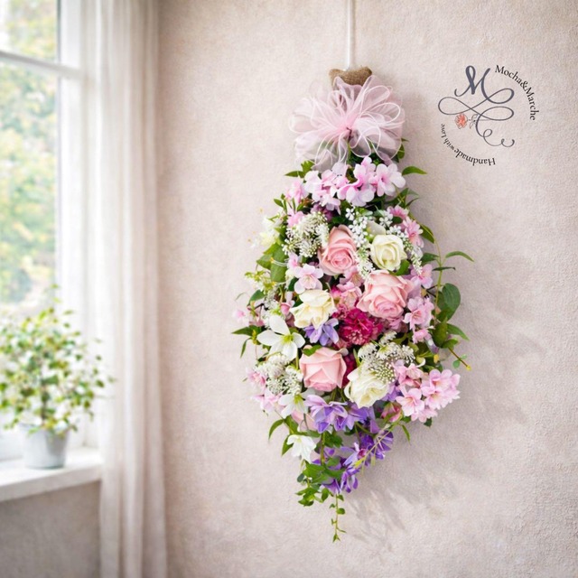 「壁一面を、春の光と桜色で満たして。」 モカアンドマルシェ(Mocha & Marche)から、春の訪れを心ゆくまで楽しめる特別なロングスワッグをお届けします。 日本の春を象徴する「桜」と、上品な「ローズ」を贅沢に組み合わせ、縦約60cmという圧倒的なボリュームで仕立てました。 ■ 暮らしを整える「光触媒」の魔法 作品全体に、太陽や照明の光に反応して消臭・除菌・抗菌効果を発揮する「光触媒」コーティングを施しています。 美しい花々を愛でるだけでなく、お部屋の空気をクリーンに保つお手伝いをしてくれる、現代の暮らしに寄り添うインテリアフラワーです。 ■ 10年目の手仕事が成す、贅沢なグラデーション • 桜とローズの共演: 繊細な桜の花びらと、気品あふれるローズの質感。 一輪一輪の配置にこだわり、どこから眺めても美しい立体感を追求しました。 • 圧倒的なサイズ感: 縦約60cm、玄関ドアやリビングのメインウォールを、ドラマチックに演出します。 • アーティフィシャルフラワー: メンテナンスフリーで、桜の儚くも美しい姿を永くお楽しみいただけます。 ■ こんなシーンにおすすめ • 春の新生活・新築祝いに: 新しい門出を祝う、他にはない豪華なギフトとして。 • 大切なお客様を迎える場所に: サロンやショップ、ご自宅の玄関を華やかに彩るアイキャッチとして。 • 特別な記念日の贈り物に: 花束のように抱えられるサイズ感は、プレゼントとしての存在感も抜群です。 商品サイズ • 全体サイズ: 縦 約60cm × 横 約35cm(最大部) • 梱包サイズ: 120サイズ専用ダンボールにてお届け 作家からのメッセージ 10年という月日の中で磨いてきた「花と向き合う時間」。 その集大成のひとつとして、この特大スワッグを制作しました。 扉を開けるたび、視線を向けるたびに、春の穏やかな風を感じていただけますように。 ---------------------------- ☆気持ちよくお取引いただくために、必ずご確認ください ■ すべて一点ものですので、再販はございません。 制作予定や再出品の予定も未定となります。 ■ オーダー(特注)の受付は行っておりません。 ■ 使用しているお花はすべてアーティフィシャルフラワー(造花)です。 ■ ご覧になる端末や撮影環境により、実物と多少色味が異なる場合がございます。 ■ 発送前に十分チェックしておりますが、ハンドメイド作品のため 配送中の振動などでパーツが外れる場合がございます。 その際は、お手数ですが木工用ボンドやグルーガンで接着をお願いいたします。 ■ 発送は5日以内を予定しております。 (ご購入後に光触媒商品のコーティングを行っております) ■ 丁寧に梱包しておりますが、壊れやすい商品のため 配送中に破損が発生する場合がございます。 万が一破損があった場合は、すぐにご連絡ください。 配送会社とのやり取りの際に、破損部分の写真をご提示いただくことがございます。 ---------------------------- #春のインテリア #春の花 #春アレンジ #フラワーアレンジメント #フラワーリース #フラワースワッグ #ミモザ #桜アレンジ #ローズアレンジ #入学祝い #卒業祝い #退職祝い #送別ギフト #記念日プレゼント #新築祝い #玄関インテリア #ナチュラルインテリア #花のある暮らし #アーティフィシャルフラワー #造花