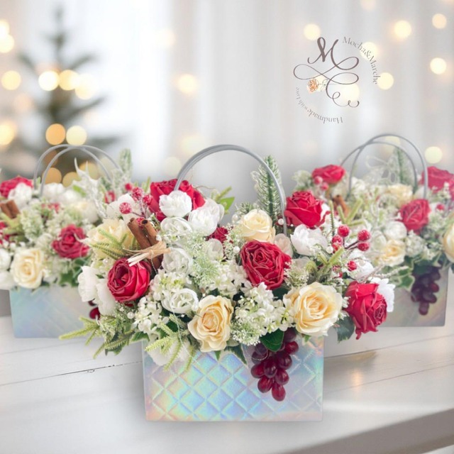 きらめく冬の魔法を閉じ込めた、クリスマス限定アレンジメントが登場しました。 光沢のあるパールホワイトのボックスに、真っ赤なローズとやさしいクリームホワイトのフラワーをぎゅっと詰め込み、まるで雪が舞い降りたような幻想的な彩りに仕上げています◌ ͙❁˚ きらめくグリーンやベリー、シナモンのアクセントが加わり、クリスマスの華やかな雰囲気をより一層引き立てます。 ボックスは光の角度で表情を変える高級感あるデザイン。 まるでクリスマスギフトをそのまま飾っているような存在感で、玄関やリビングに置くだけでお部屋全体を明るく彩ります。 雪景色を思わせるやさしいホワイトと、心温まるレッドのコントラストが、大切なひとときに寄り添い、クリスマス気分を盛り上げてくれることでしょう。 光触媒加工を施しているため、空気清浄効果が期待でき、清潔で快適な空間づくりにも役立ちます。 お花を飾る喜びと、健やかな空気を同時にお届けする、特別なアレンジメントです。 サイズ 幅:約35cm × 奥行:約23cm × 高さ:約33cm ボックス素材:紙 ---------------------------------------------------- 【ご購入前に必ずご確認ください】 ■ 当ショップの作品はすべて一点ものです。再販予定はございません。 制作・再出品も未定となります。 ■ オーダー(特注)は承っておりません。 ■ 使用している花材はすべてアーティフィシャルフラワー(造花)です。 ■ モニター環境や撮影状況により、実物と多少色味が異なる場合がございます。 ■ ハンドメイド作品のため、配送中の振動等でパーツが外れる場合がございます。 万が一外れた場合は、木工用ボンドやグルーガンでの接着をお願いいたします。 ■ 発送は通常5日以内となります。 (ご購入後に光触媒コーティングを施しております) ■ 厳重に梱包しておりますが、壊れやすい商品のため 配送時に破損が発生する場合がございます。 その際は速やかにご連絡ください。 配送会社への連絡時に、破損部分の写真をご提示いただく場合がございます。 #クリスマスリース #クリスマスアレンジ #クリスマスインテリア #クリスマス飾り #クリスマスオブジェ #お正月飾り #正月リース #門松 #正月アレンジ #冬のインテリア #ローズアレンジ #結婚祝い #新築祝い #退職祝い #送別ギフト #記念日プレゼント #花瓶付き #高級 #癒しの空間 #花のある暮らし #玄関 #壁飾り #店舗 #受付 #ラウンジ #フラワーリース #フラワースワッグ #花束 #ブーケ #アーティフィシャルフラワー #フェイクフラワー #シルクフラワー #造花 #光触媒 #ArtificialFlower #Bouquet