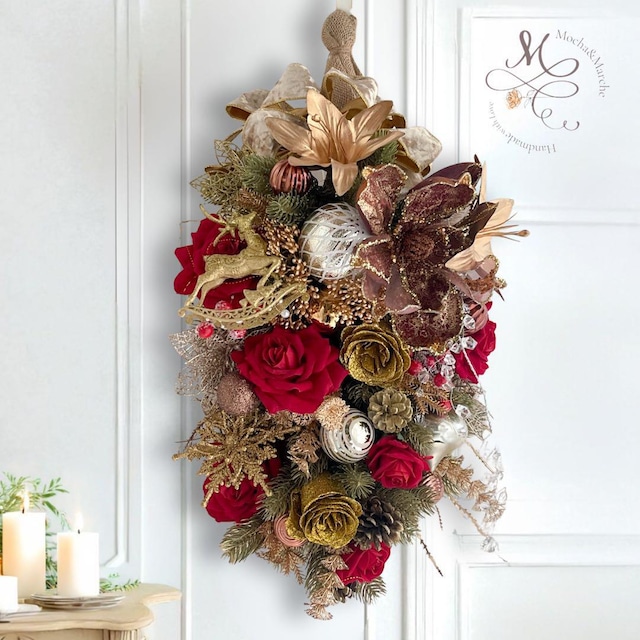 贅沢に煌めく、ラグジュアリークリスマス◌ ͙❁˚ まるで海外のラグジュアリーホテルを思わせる、 深紅のローズとゴールドの装飾が織りなす華やかなクリスマススワッグです◌ ͙❁˚ 光を受けて輝くリボンやオーナメント、リーフの繊細な輝きがまるで「冬の魔法」に包まれたような特別な時間を演出します。 上部に咲くブロンズリのクリスマスローズやグリッターの花々が上品な艶を添え、中央には優雅なトナカイとオーナメントが煌めき、まるで一つのアートピースのような存在感◌ ͙❁˚ 玄関やリビングに飾れば、まさに“迎える空間”そのものが格上げされます。 「今年は少し特別なクリスマスにしたい」 そんな大人の願いを叶える、圧倒的な存在感と気品を兼ね備えた逸品です。 ご自宅はもちろん、サロンやホテルのエントランスにもおすすめ☆ 見るたびに胸が高鳴るような、心ときめく華やかさをお届けします。 ・サイズ:約W33×H60×D25cm ・使用花材:アーティフィシャルフラワー(光触媒加工) ・カラー:レッド×ゴールド×ブロンズ ・装飾:オーナメント・松ぼっくり・リボン・トナカイモチーフ ・麻紐式吊り下げタイプ ---------------------------------------------------- 【ご購入前に必ずご確認ください】 ■ 当ショップの作品はすべて一点ものです。再販予定はございません。 制作・再出品も未定となります。 ■ オーダー(特注)は承っておりません。 ■ 使用している花材はすべてアーティフィシャルフラワー(造花)です。 ■ モニター環境や撮影状況により、実物と多少色味が異なる場合がございます。 ■ ハンドメイド作品のため、配送中の振動等でパーツが外れる場合がございます。 万が一外れた場合は、木工用ボンドやグルーガンでの接着をお願いいたします。 ■ 発送は通常5日以内となります。 (ご購入後に光触媒コーティングを施しております) ■ 厳重に梱包しておりますが、壊れやすい商品のため 配送時に破損が発生する場合がございます。 その際は速やかにご連絡ください。 配送会社への連絡時に、破損部分の写真をご提示いただく場合がございます。 ---------------------------------------------------- #クリスマスリース #クリスマスアレンジ #クリスマスインテリア #クリスマス飾り #クリスマスオブジェ #クリスマス雑貨 #クリスマスデコレーション #クリスマスギフト #クリスマスプレゼント #冬のインテリア #おしゃれな贈り物 #フラワーリース #フラワースワッグ #花束 #ブーケ #花瓶付き #高級 #アーティフィシャルフラワー #フェイクフラワー #シルクフラワー #造花 #光触媒 #癒しの空間 #花のある暮らし #ナチュラルインテリア #ボタニカルライフ #玄関 #リビング #店舗 #受付 #ArtificialFlower #ChristmasWreath #ChristmasGift