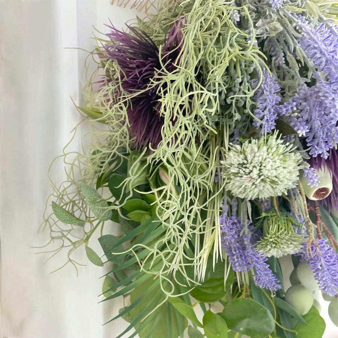 ラベンダーの柔らかな色合いと、ユーカリの実やスパニッシュモスのナチュラルな風合いが、まるで自然の中にいるような心地よさを感じさせます。