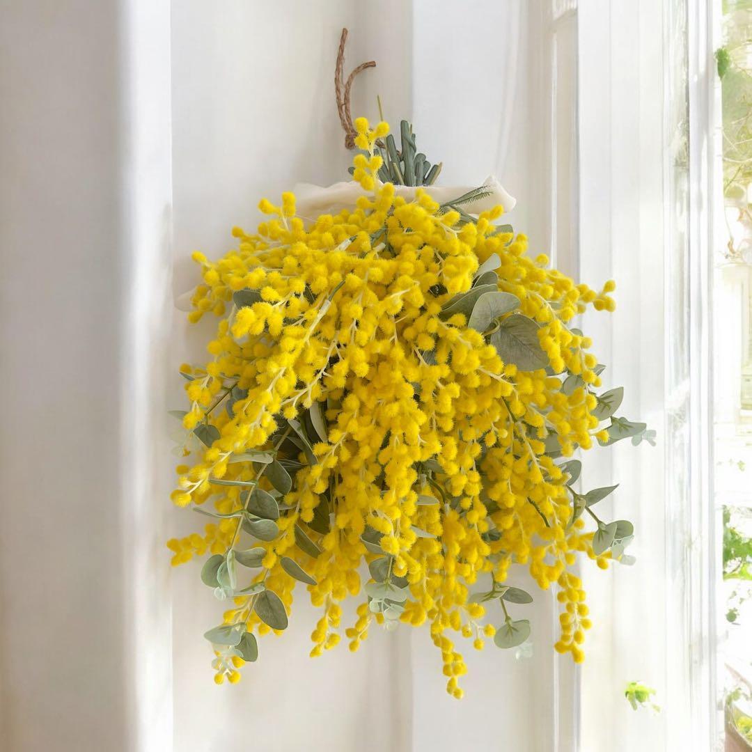 ボリュームたっぷりのミモザに、ナチュラルなユーカリを合わせ、ふんわりと優しいリネンのリボンで仕上げました。壁に飾るだけで、まるで陽だまりの中にいるような癒しの空間に。リビングや玄関、寝室に飾れば、心まで温かく包み込んでくれる特別なスワッグです。