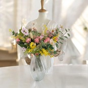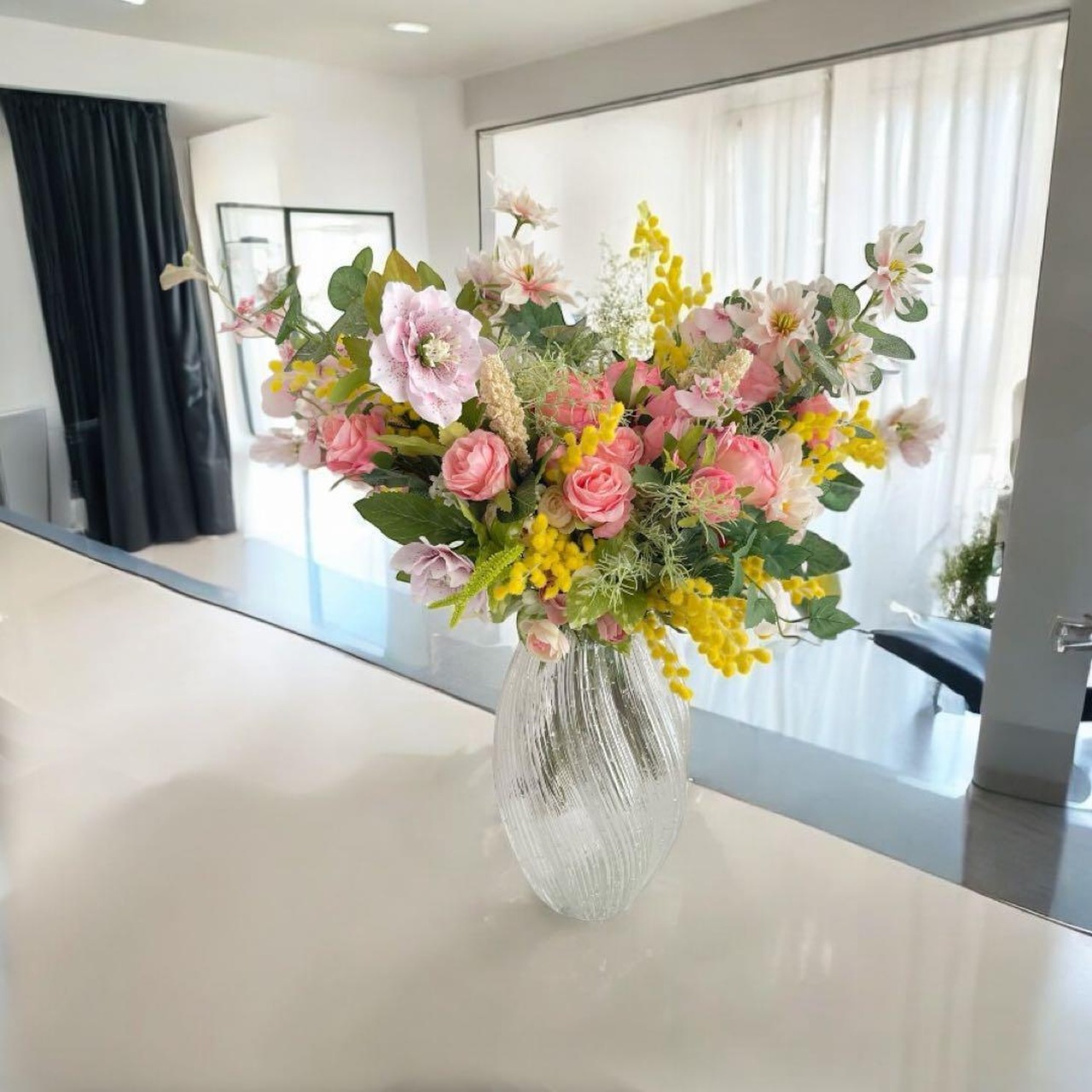 透明感のある曲線ガラスの花瓶に、ボリュームのある華やかで美しいブーケを飾りました。