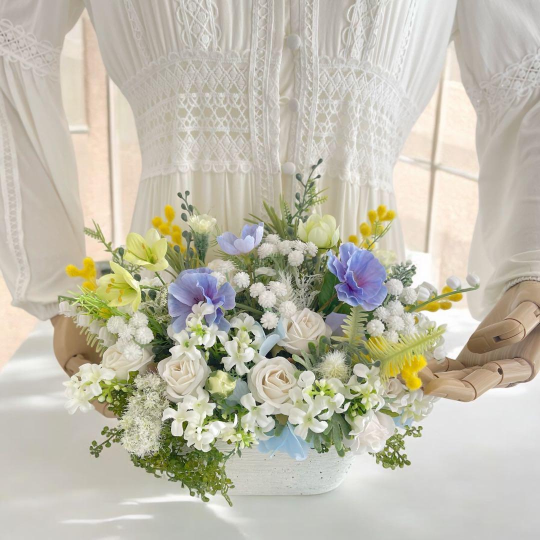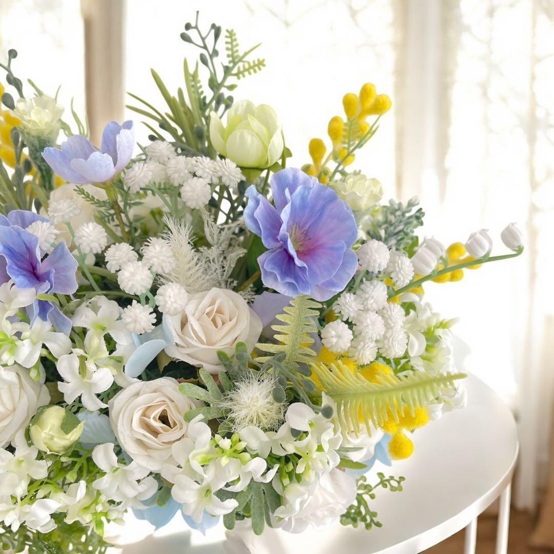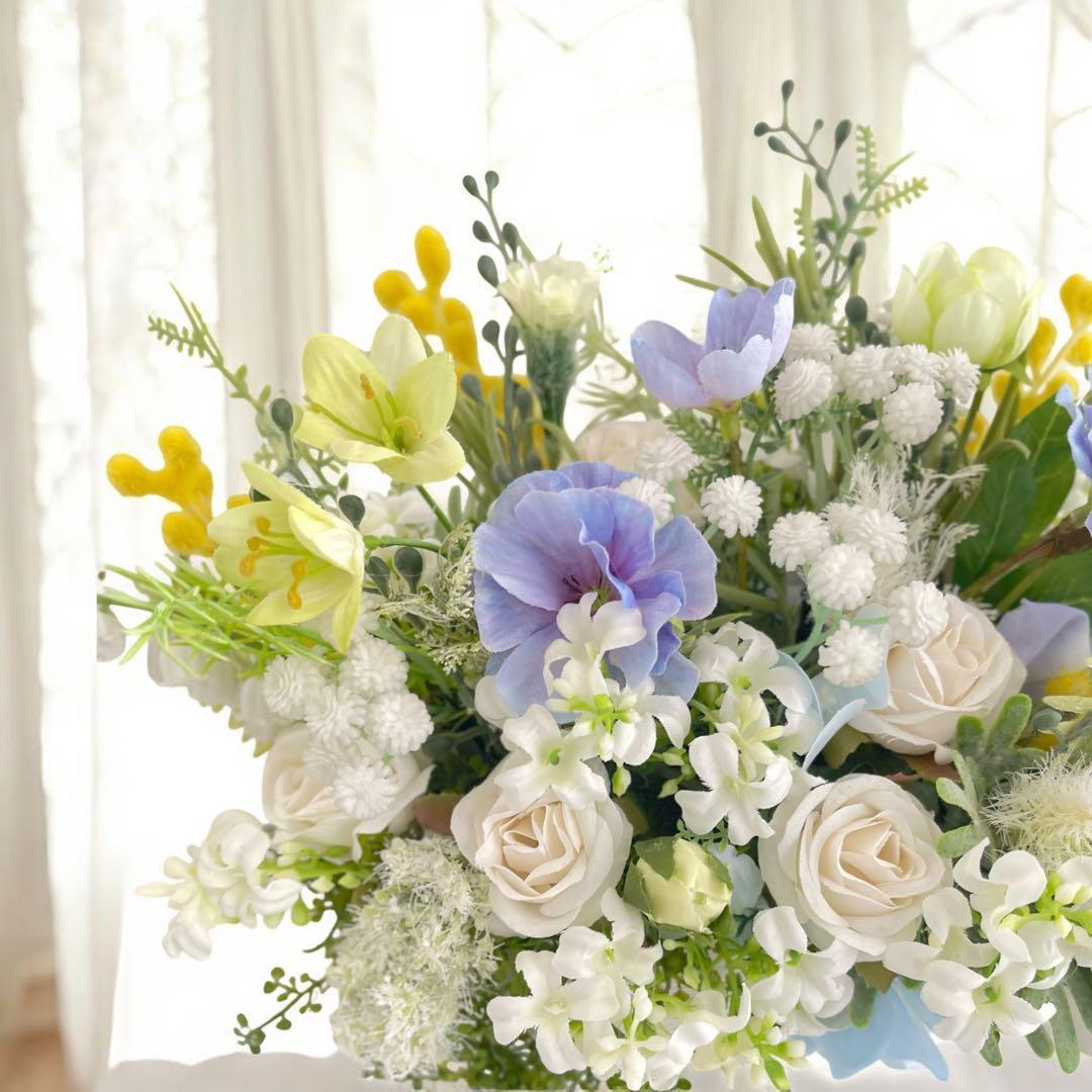 柔らかなブルーとイエローに優しいホワイトを基調に、ミモザやバイモユリ、ポピー、ライラック、カスミソウなどを贅沢にあしらい、清涼感と初夏の透明感をぎゅっと詰めこみました。