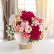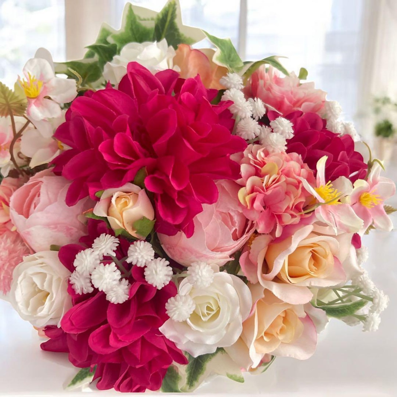 印象的な濃いピンクのダリアを中心に、白や淡いオレンジのローズ、ミニカーネーションやマム、小花を組み合わせて仕上げました。