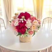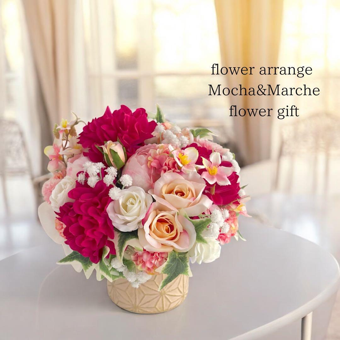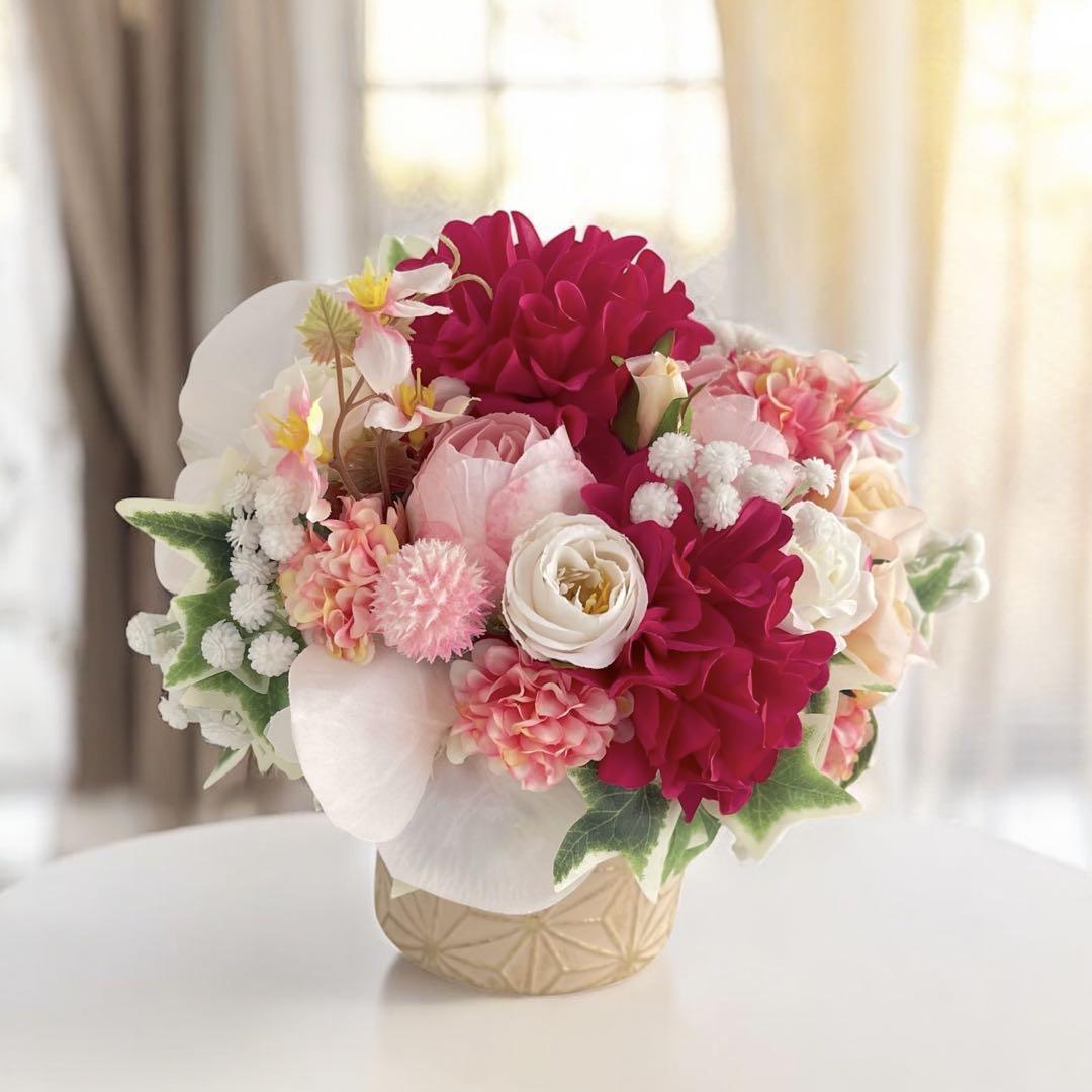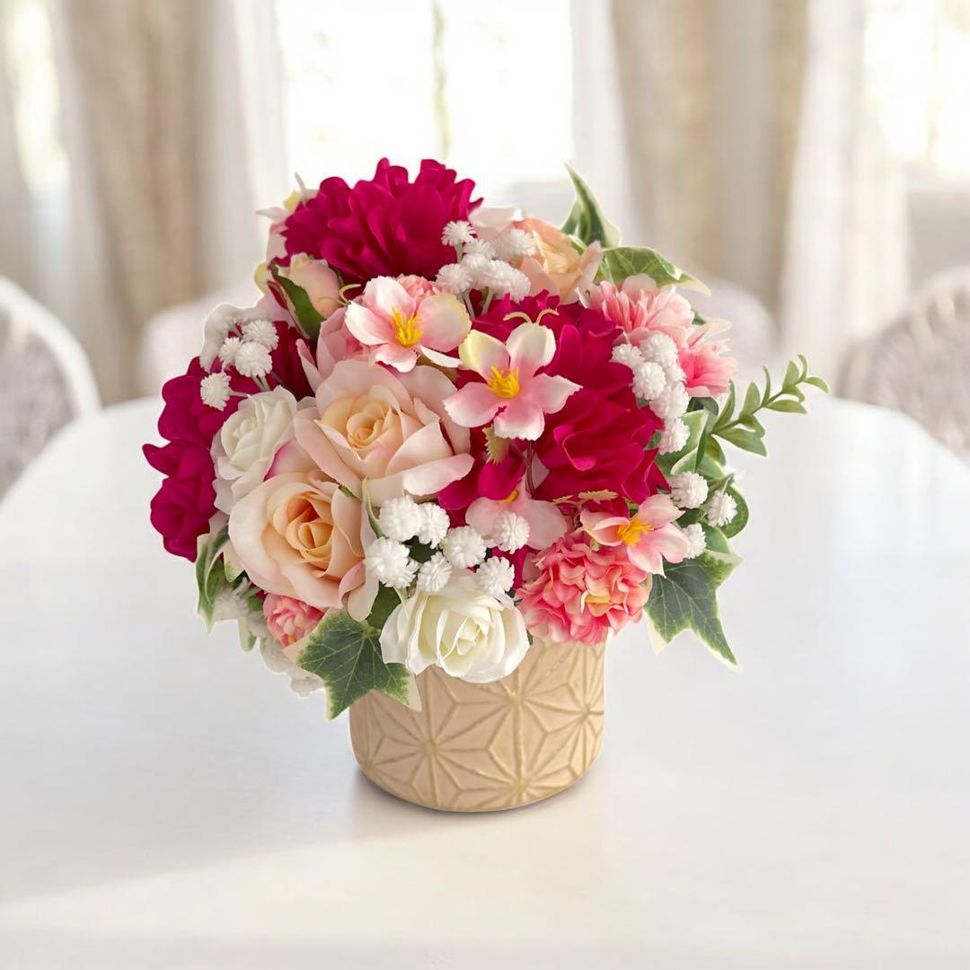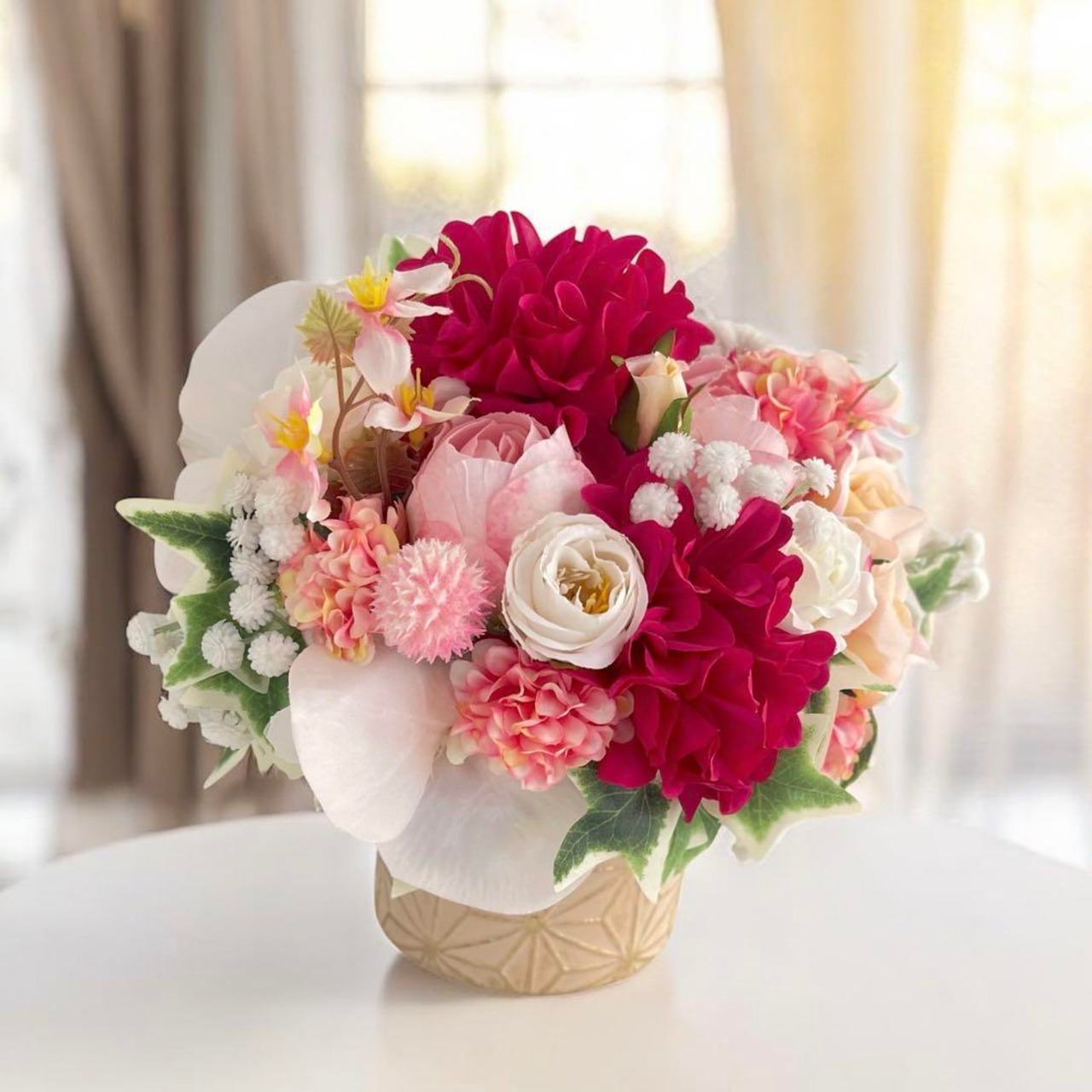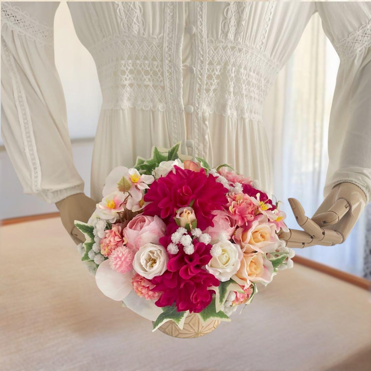 麻の葉模様の花器に咲く優しいフラワーアレンジメント|光触媒フラワー アーティフィシャルフラワー