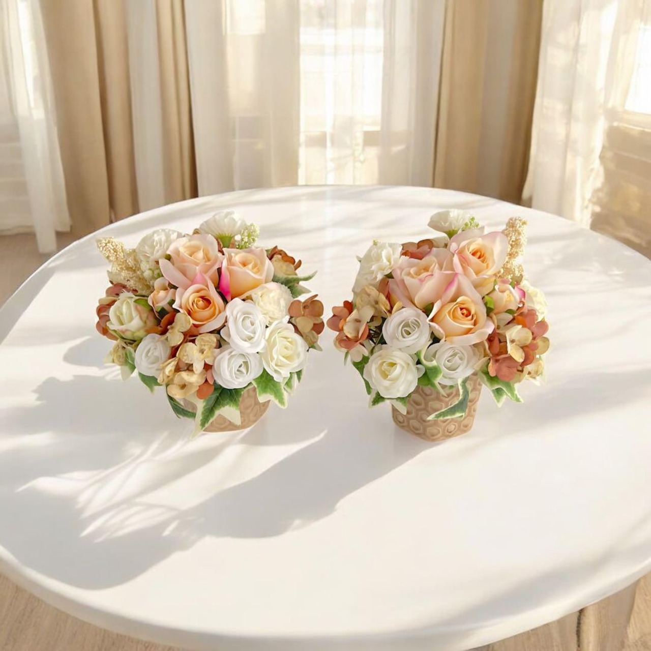 オフホワイトのバラとアイボリートーンの小花が、そっと寄り添うような雰囲気を演出し、中心のオレンジローズが故人との優しい記憶を思い出させてくれる──そんな穏やかな存在感のある一対です。
