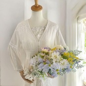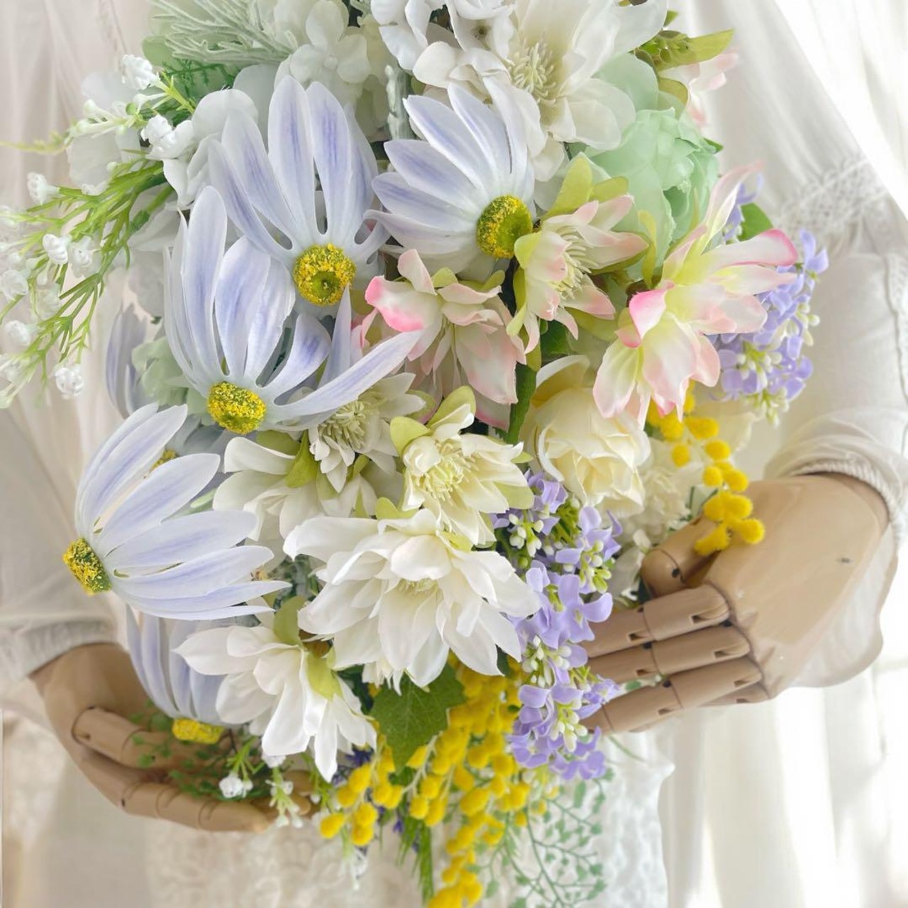やさしいラベンダーパープルのエキナセアやクレマチスに、明るいミモザやふんわりとしたカスミソウが軽やかに舞うデザイン◌ ͙❁˚