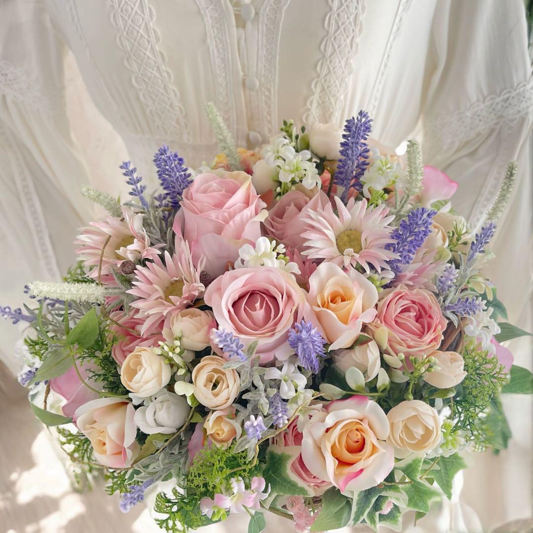 ふんわりとしたピンクローズに、ラベンダーやアイビーを添えて。まるで物語のワンシーンから抜け出したような、優雅で心ほどけるアレンジメントが完成しました。