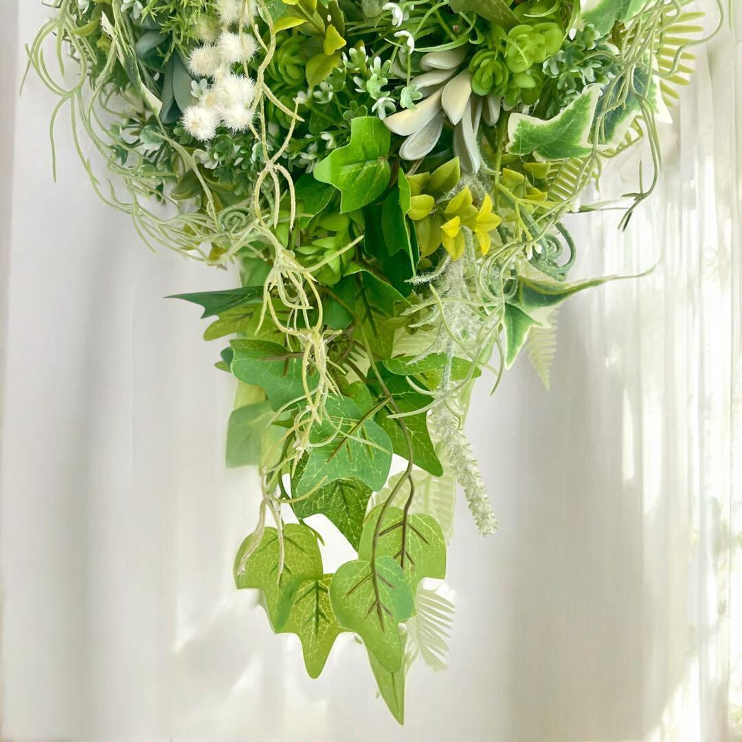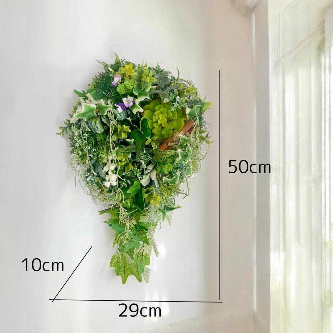 高さ約44cm×幅約30cmのサイズ感は、玄関やリビング、廊下の壁面にも飾りやすく、流れるように垂れるグリーンが、空間に動きと奥行きをプラスします。