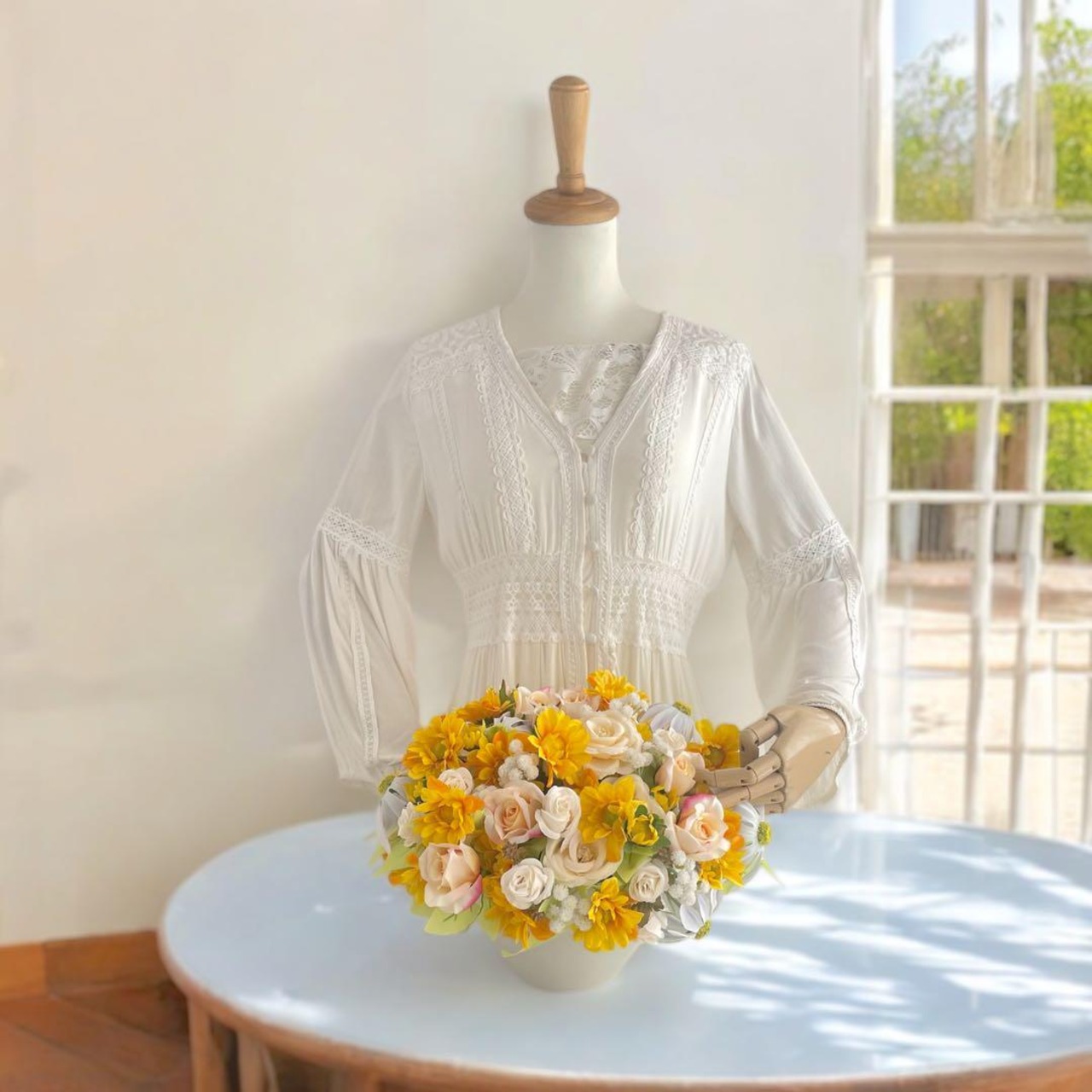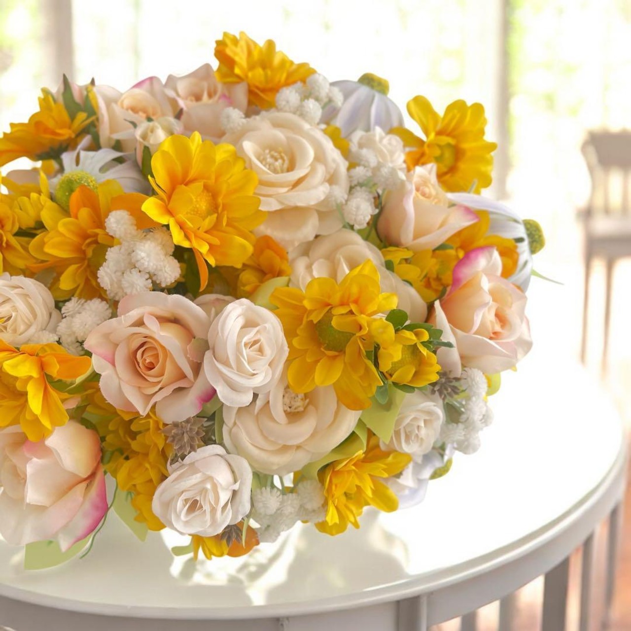 鮮やかなイエローフラワーに、優しく包み込むようなアイボリーローズを合わせ、見る人の気持ちまで明るく照らします。