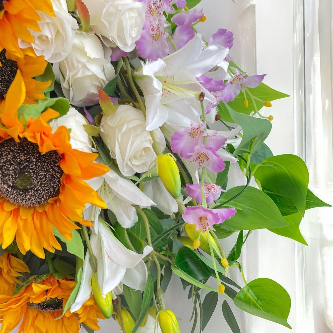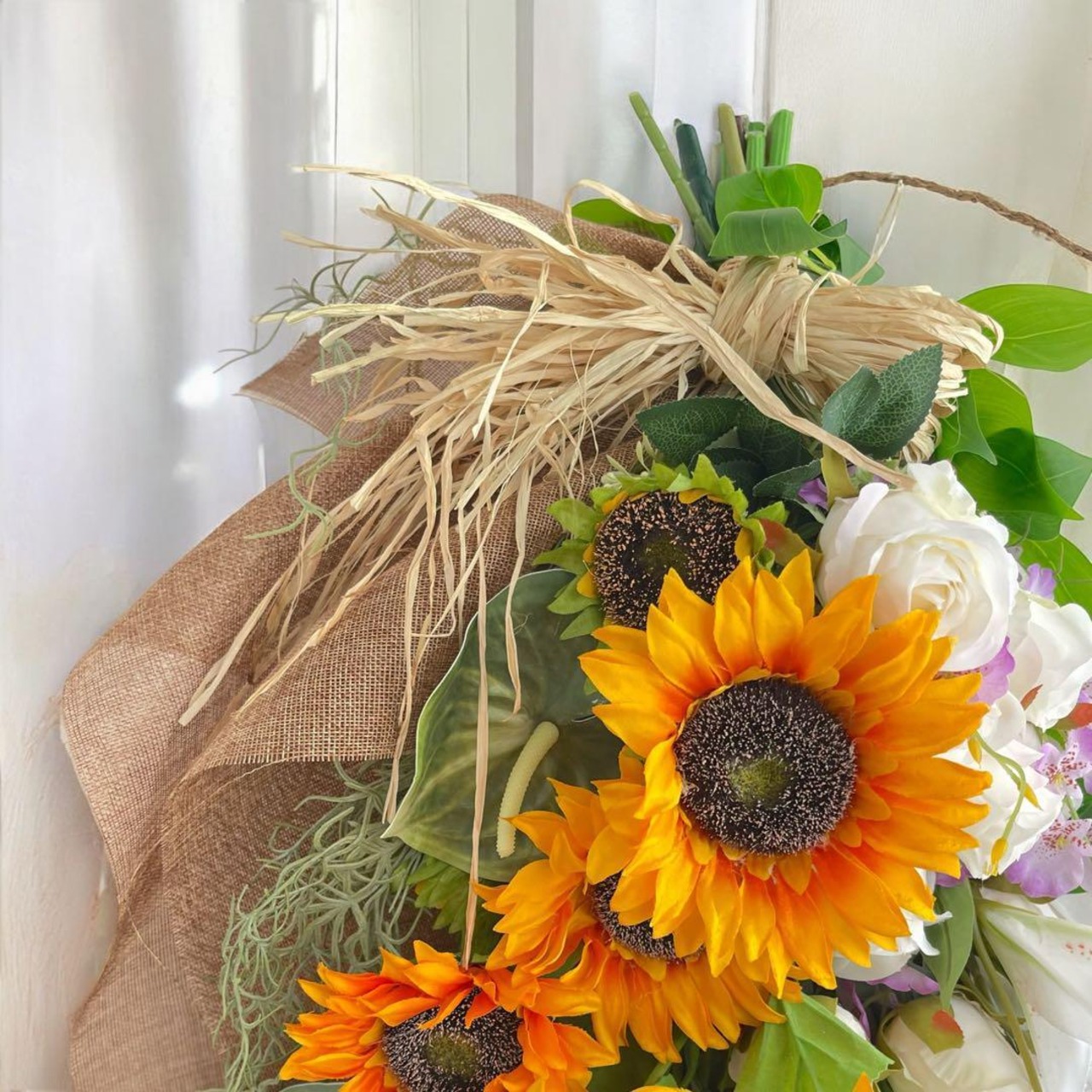 特大ひまわりとラフィアのボタニカルスワッグ/玄関を華やかに彩る夏のアレンジ