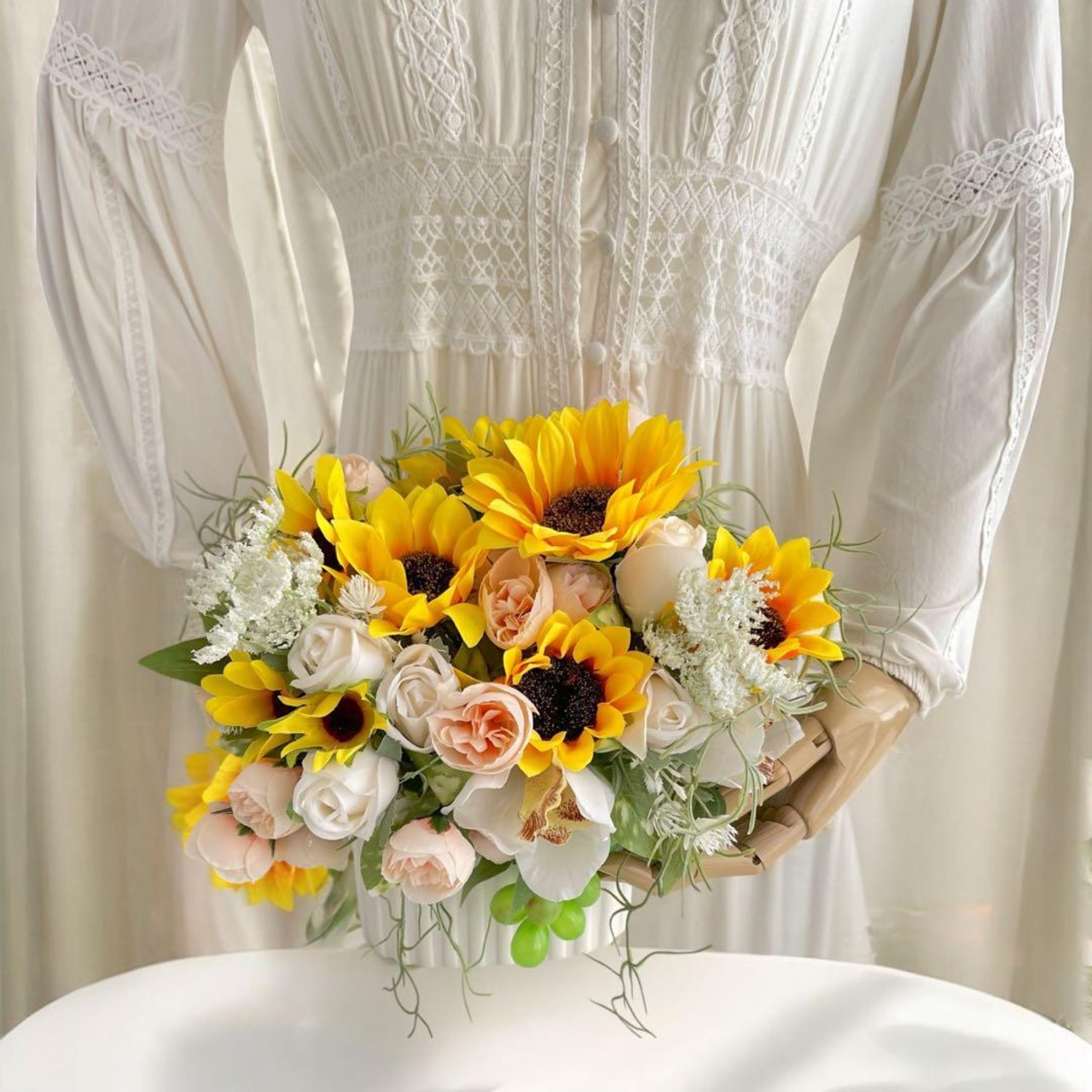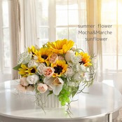 夏の主役「ひまわり」と、優しく咲くピーチローズ、気品漂うシンビジウム、繊細なレースフラワーを贅沢に束ねた、季節感あふれるアレンジメントです。