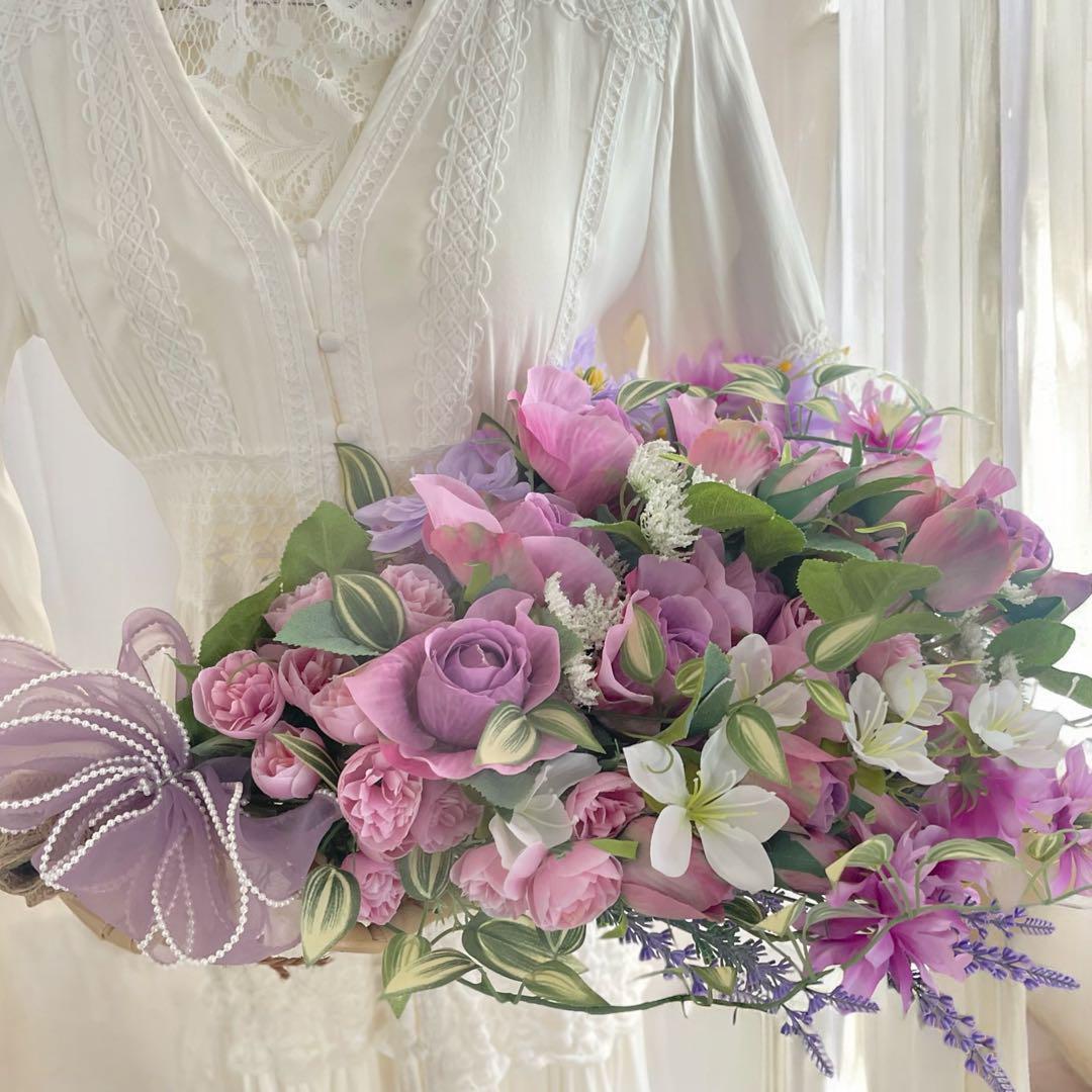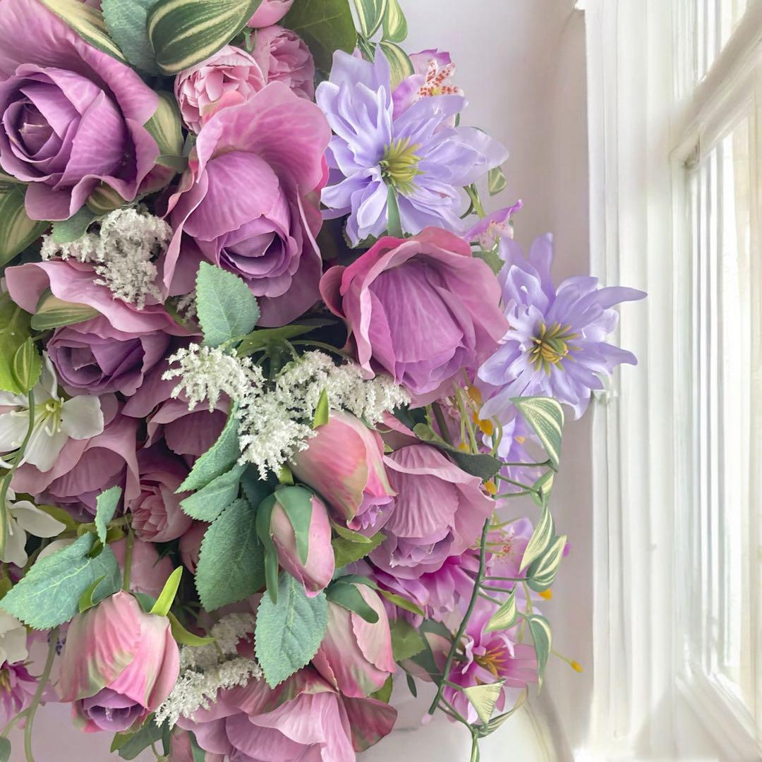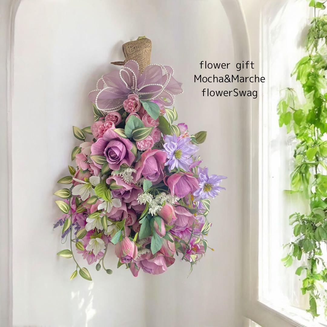 華やかなパープルのローズをメインに、繊細なミニカップローズや小花たちがふんわりと寄り添う、大人フェミニンなフラワースワッグです◌ ͙❁˚