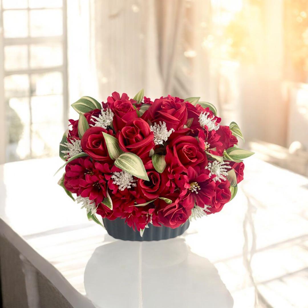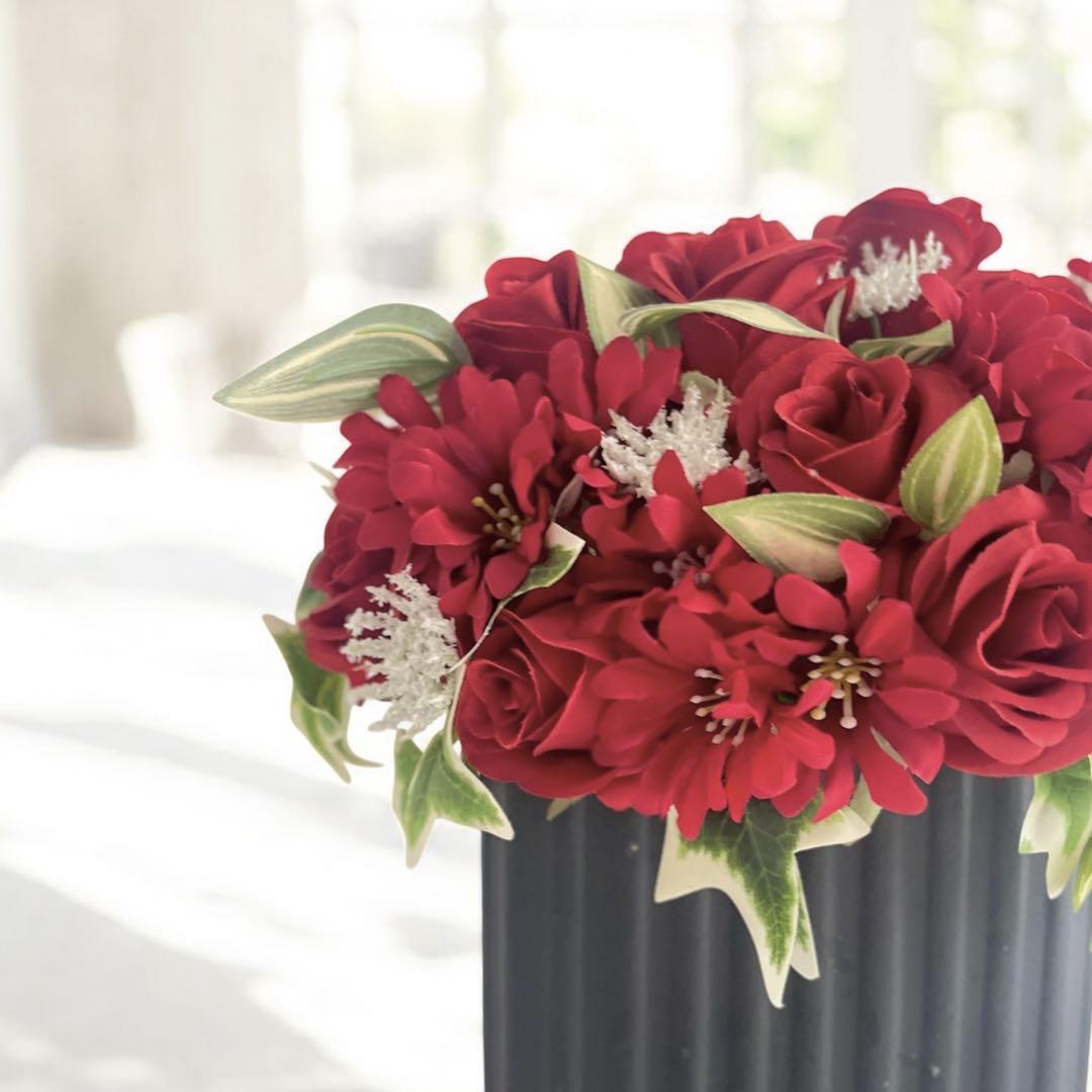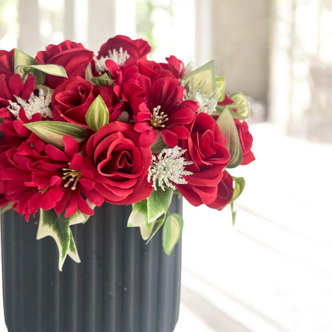 落ち着いたブラックの陶器に、赤いバラをぎゅっと詰め込んだアレンジメントです。