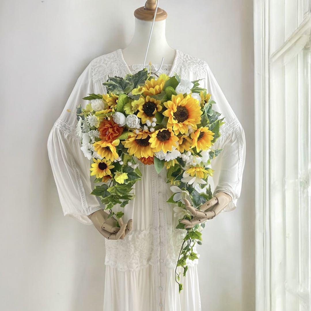 咲き誇るひまわりを中心に、ミニバラやカスミソウ、オンシジウム、アイビーなど、明るさと自然の息吹を感じる花材たちをふんだんに使用しました。