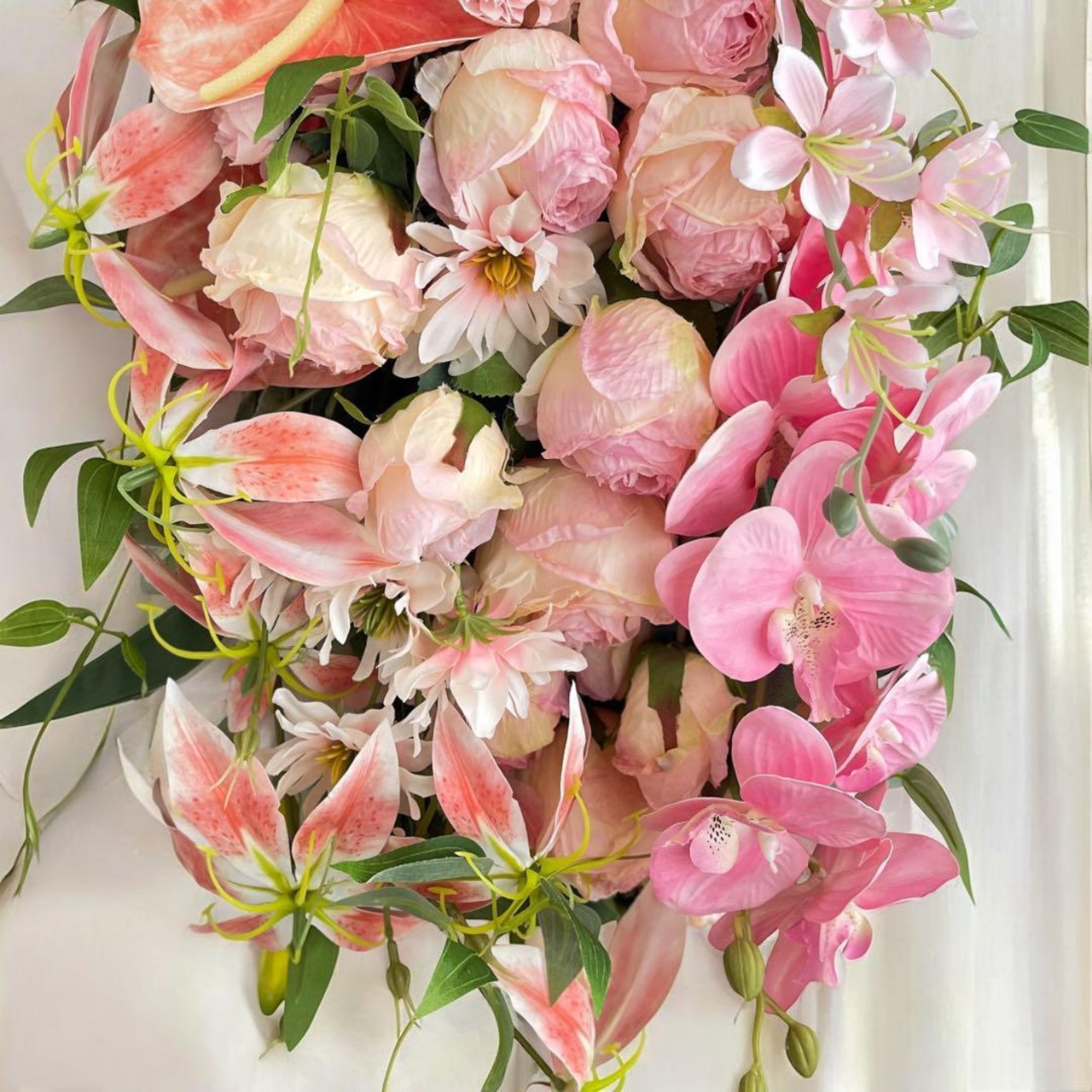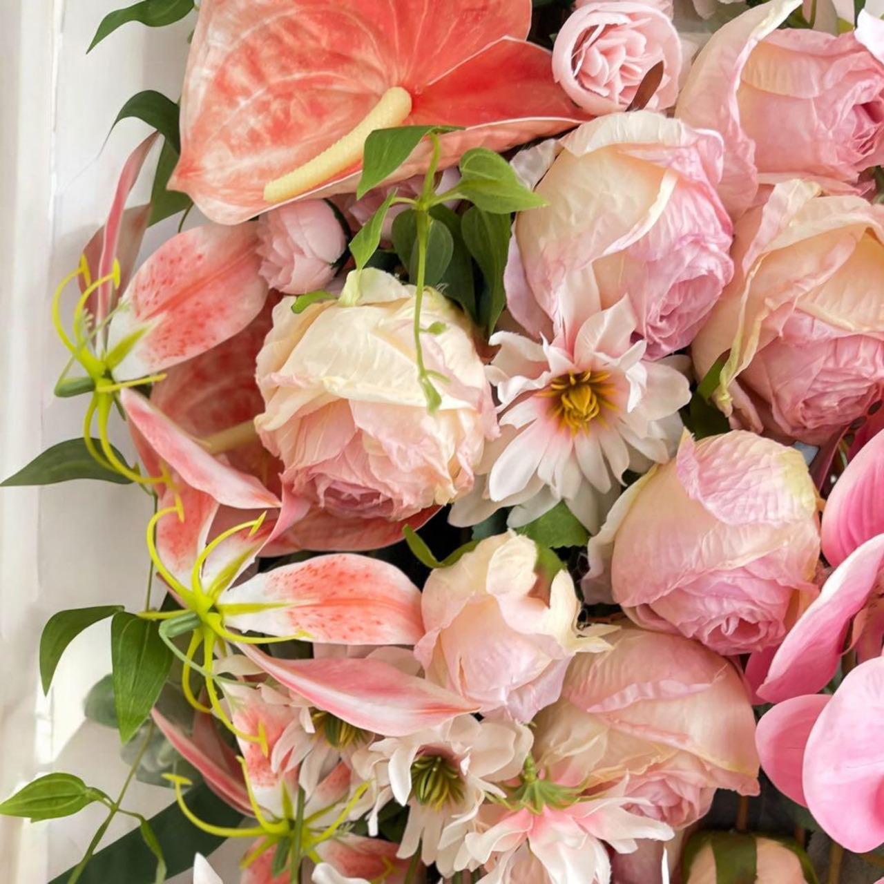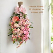 幻想的なピンクの花々が咲き誇るり、優美に広がるグラデーションが、見る人の心にやさしく溶け込んでいきく、華やかなサマースワッグです。