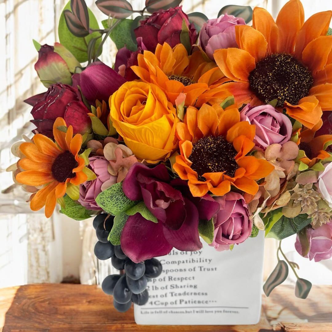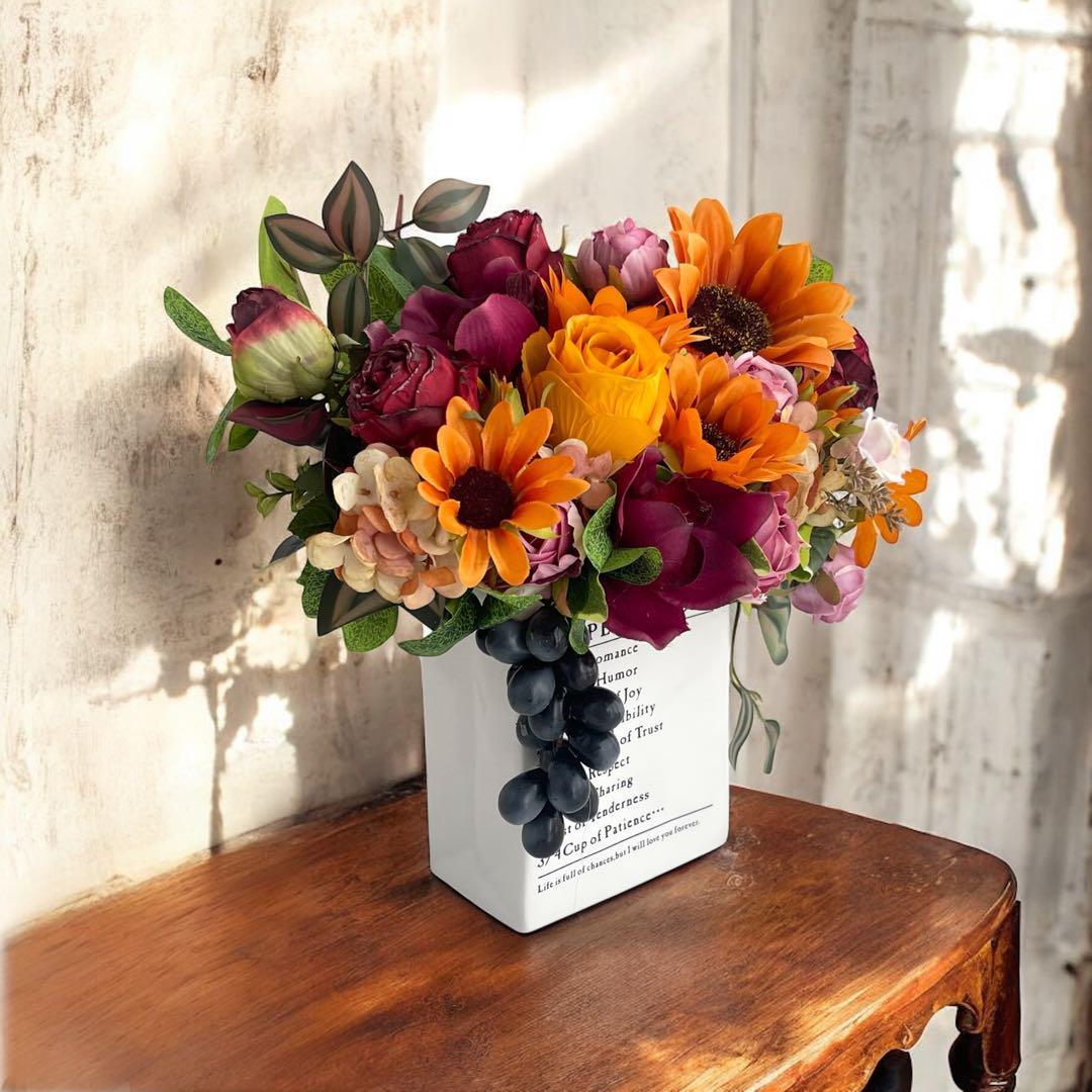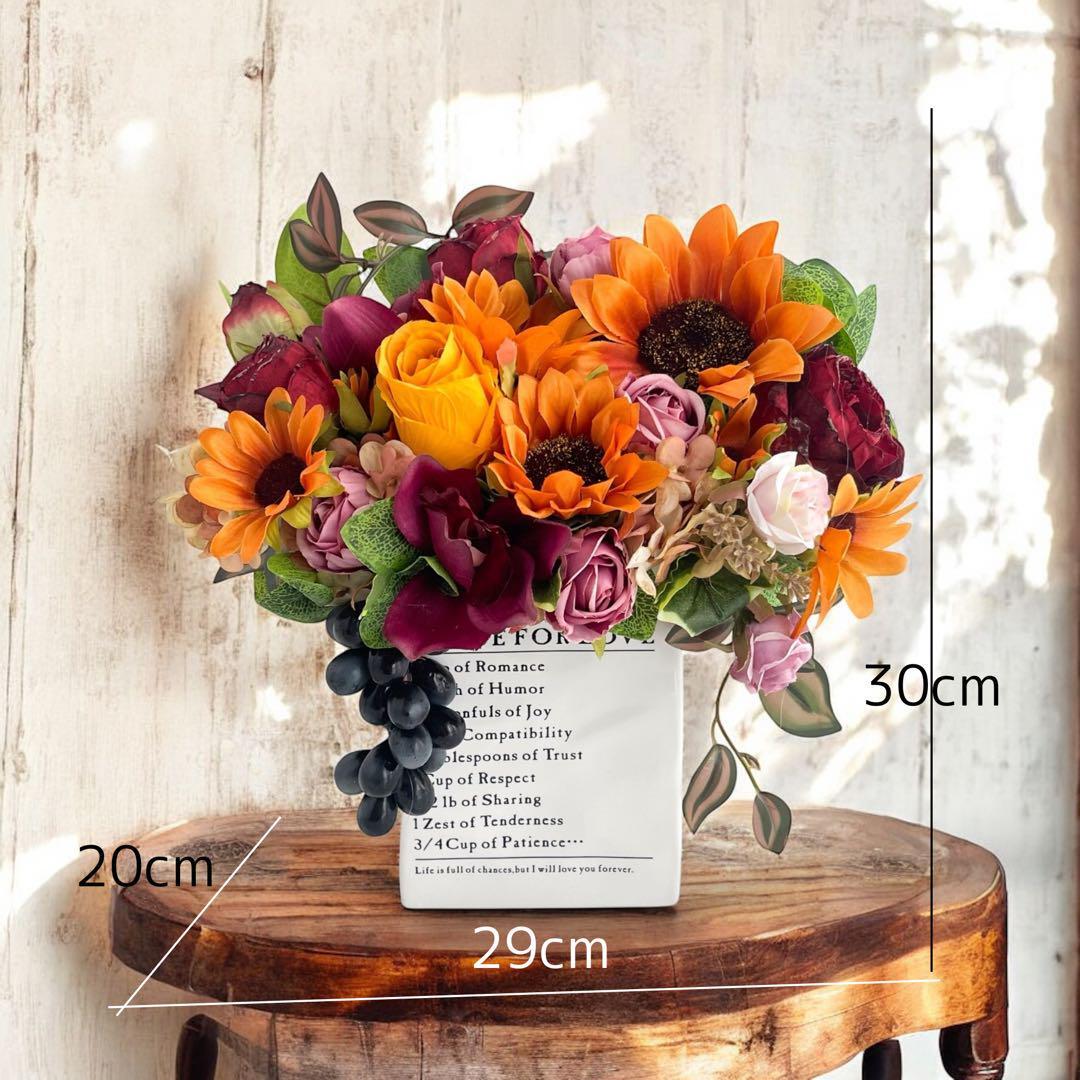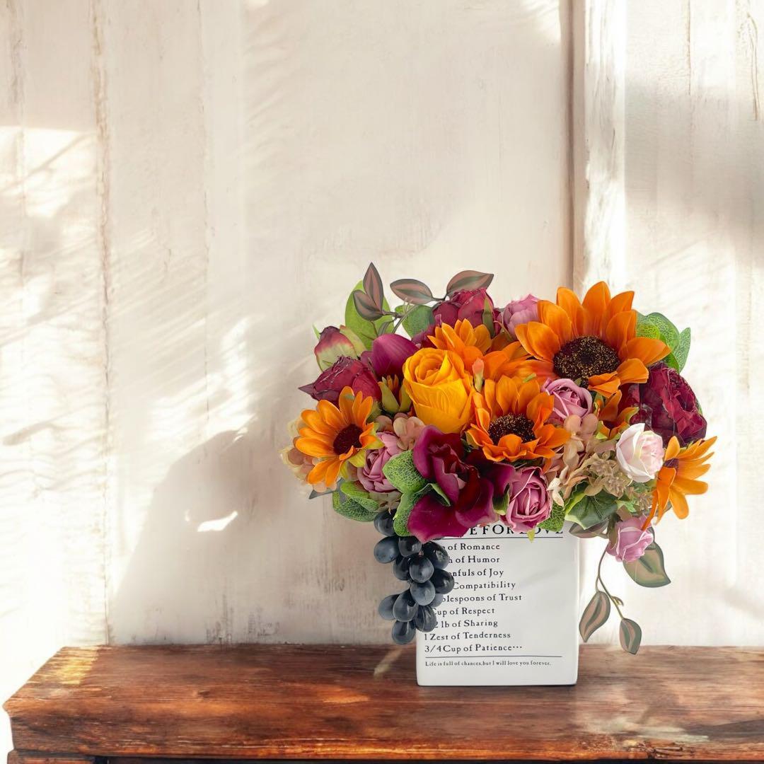 華やか夏の果実アレンジ 花瓶付きアレンジメント×向日葵と葡萄の贈り物 造花 アーティフィシャルフラワー
