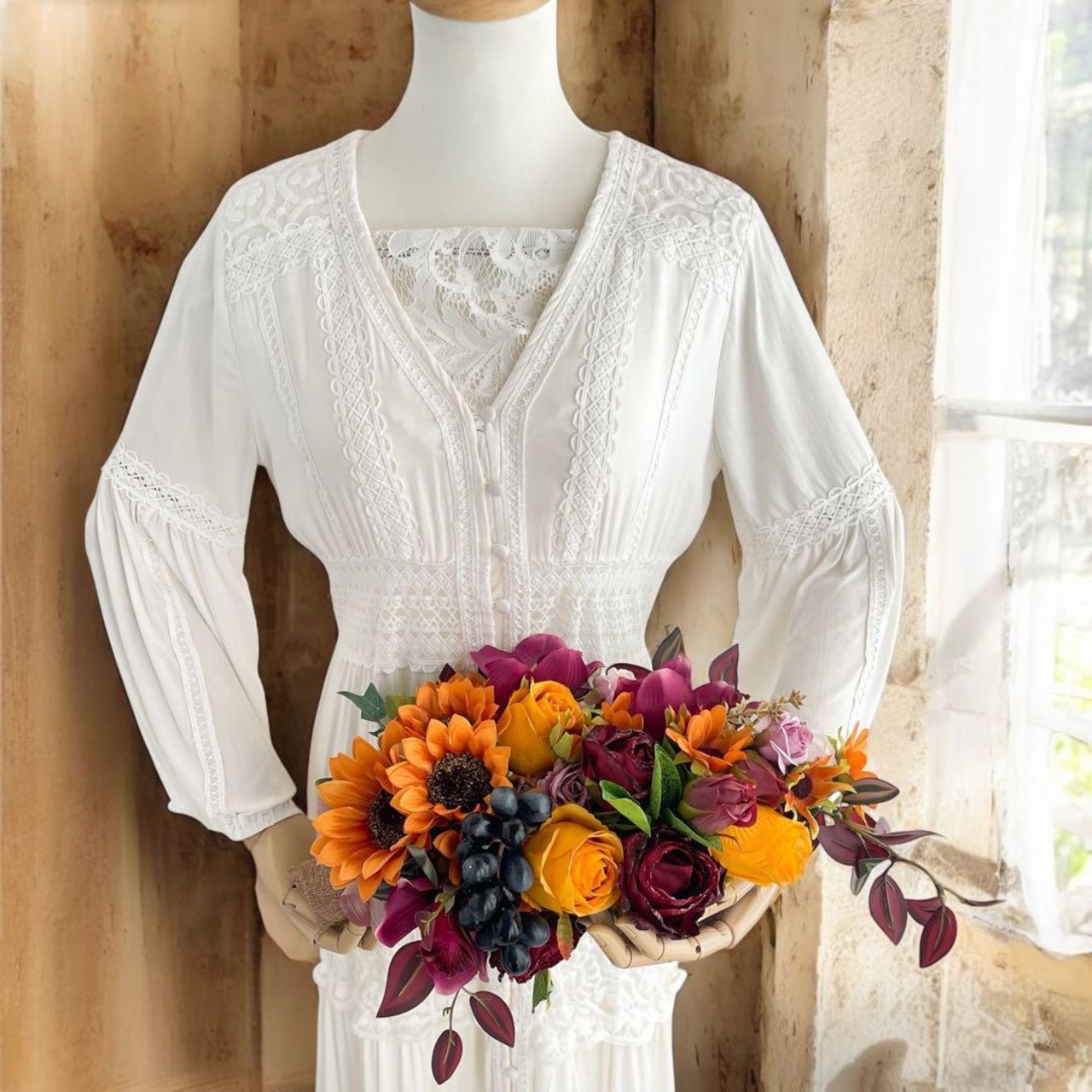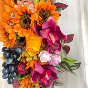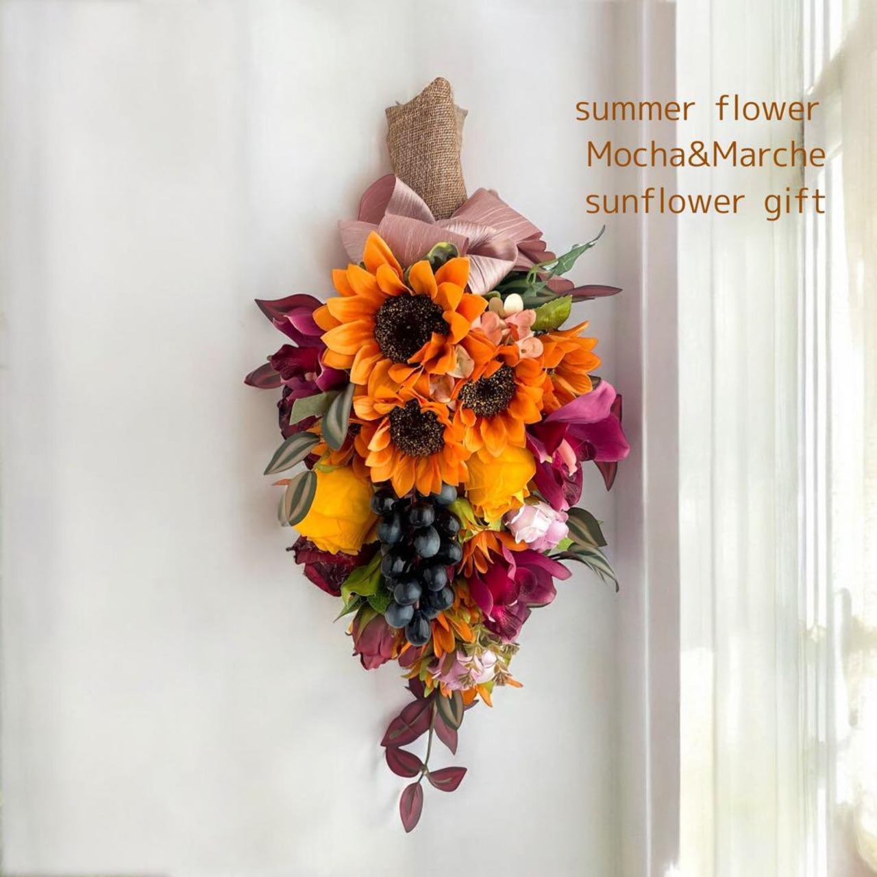 クラシカルなひまわりとアンティーク調のドライローズ、深紅のバラ、コロンとしたマスカット…ひとつひとつの素材が奏でる物語が、見る人の心をふわっと夏色に染めてくれます。