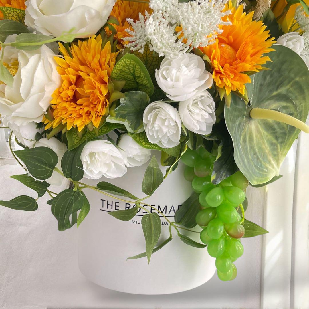 清潔感のある白いローズが全体をやさしくまとめ、マスカットのアクセントが遊び心をプラスしています。