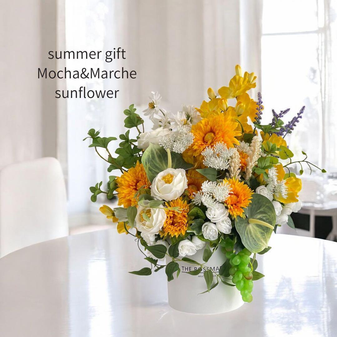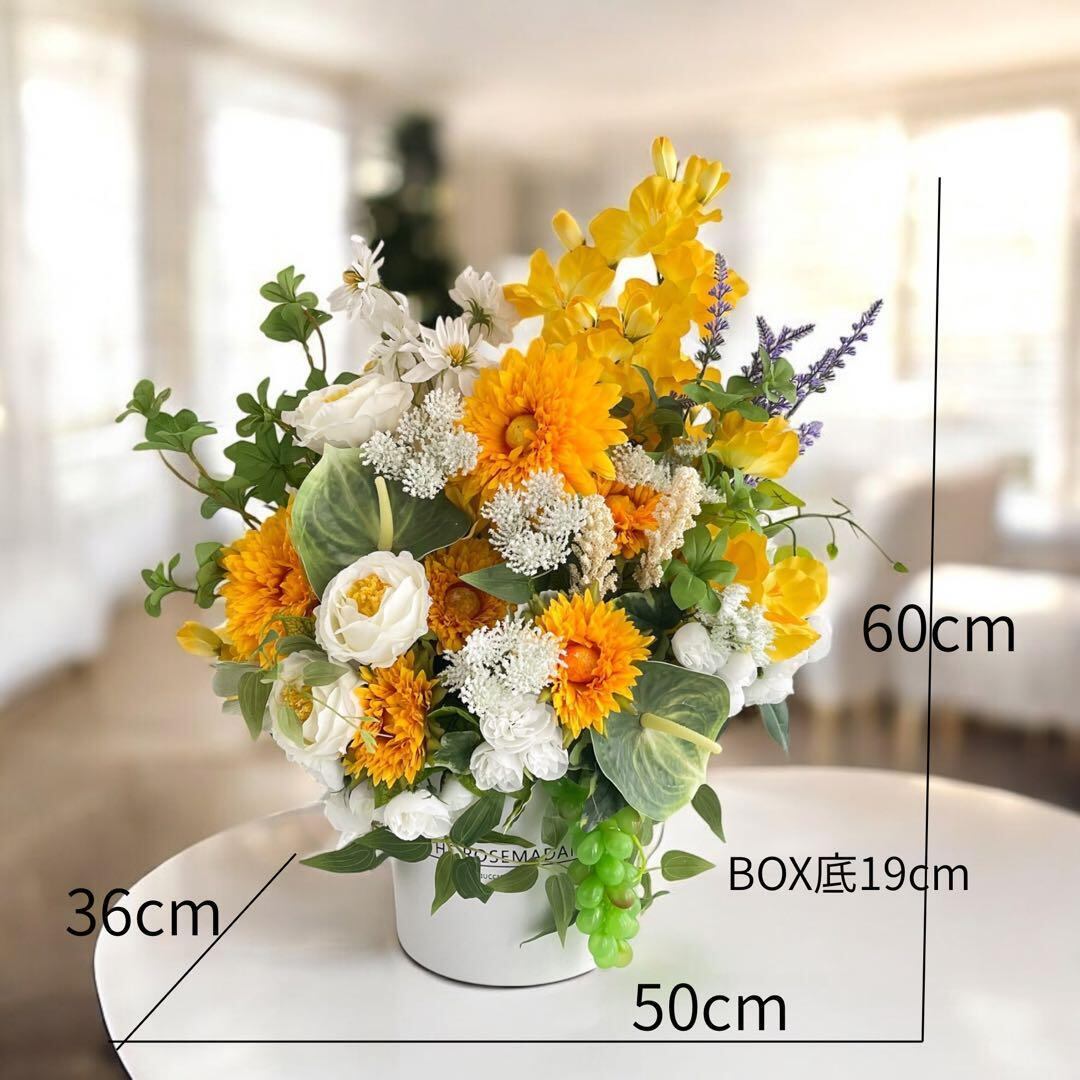 特大ひまわりとグリーンの夏アレンジメント*ボックスフラワーギフト 光触媒フラワー アーティフィシャルフラワー サマーアレンジ 夏飾り お中元
