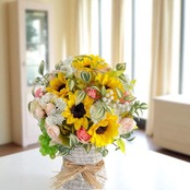 ナチュラルで涼しげな花束風の花器に、まるで太陽をそのまま束ねたような向日葵(ひまわり)をふんだんにアレンジしました。