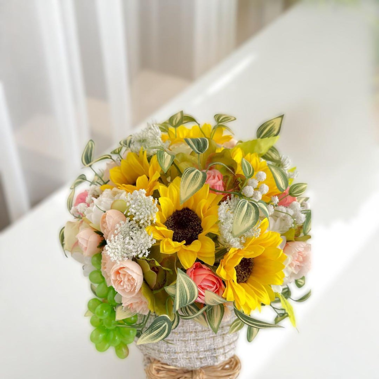 ピンクやアプリコットカラーのローズ、白のレースフラワー、小粒のグリーンマスカットがアクセントになり、まるで夏の庭のような華やかさです。