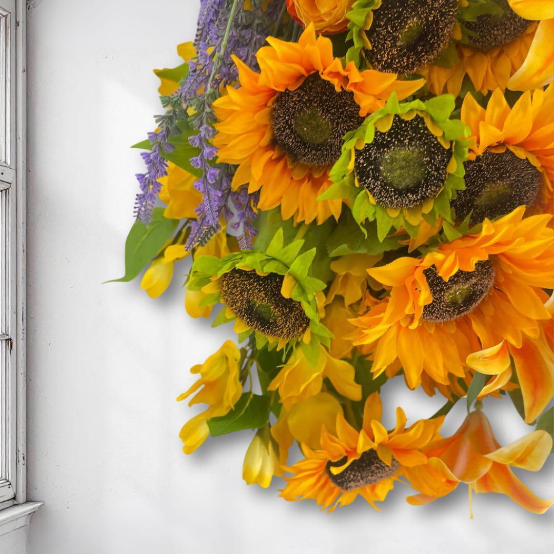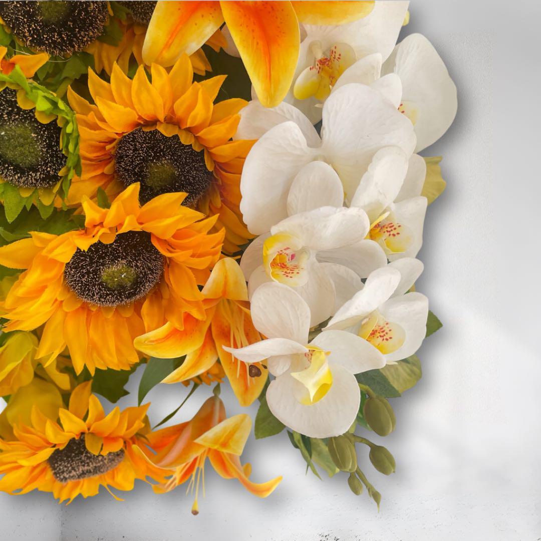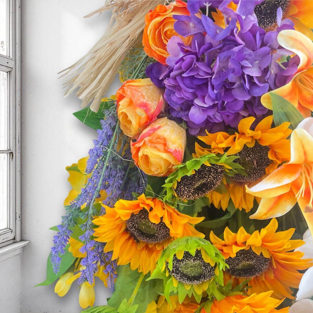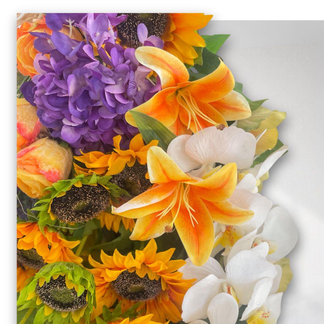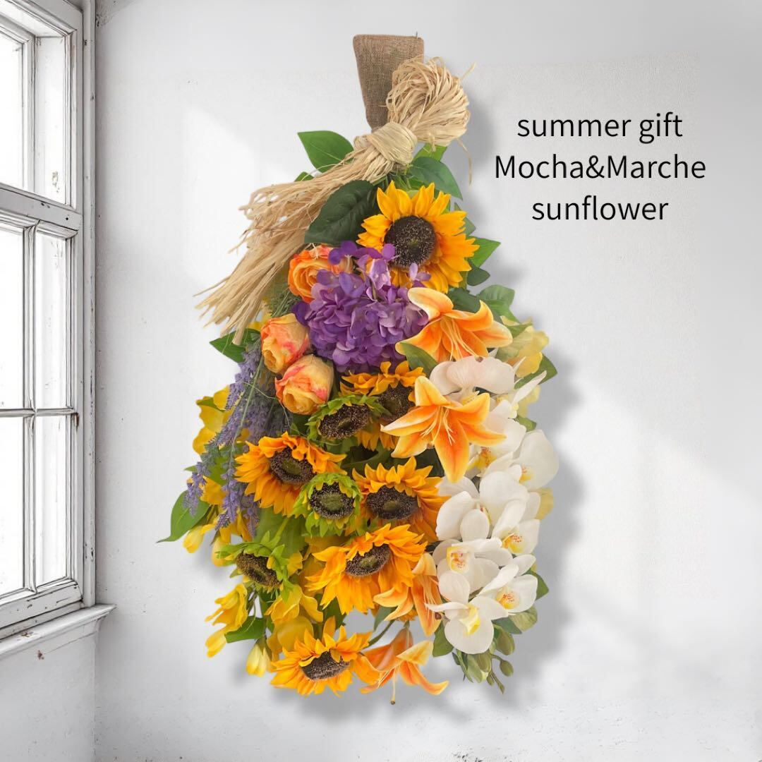 南国の太陽を感じさせる向日葵に、鮮やかなオレンジの百合、優美な胡蝶蘭、ラベンダーや紫陽花のアンティークな彩りが重なり合う、エキゾチックな特大スワッグ。