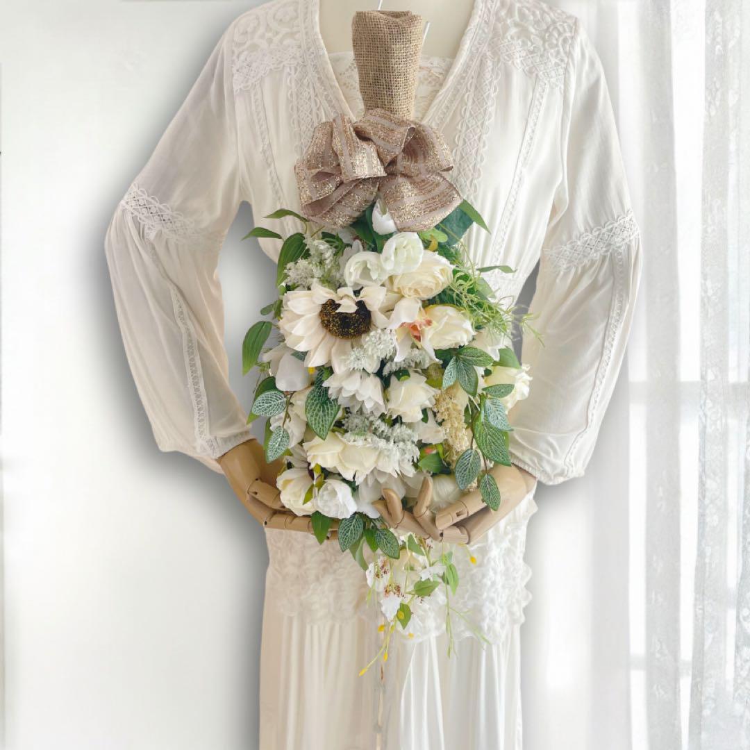 やさしいホワイトベージュをまとった、洗練された印象のひまわりを主役に、上品でナチュラルなグリーンと