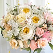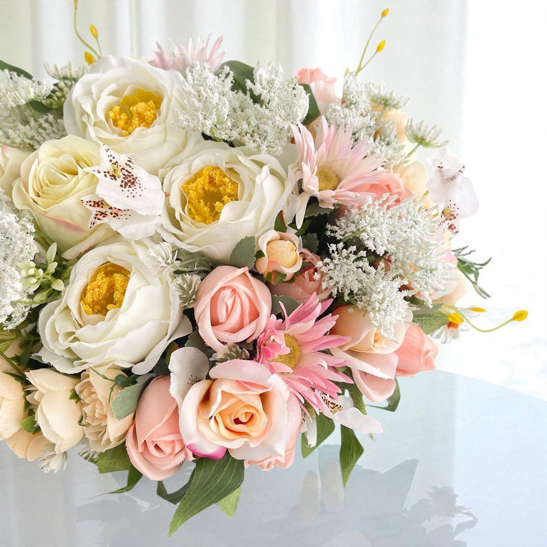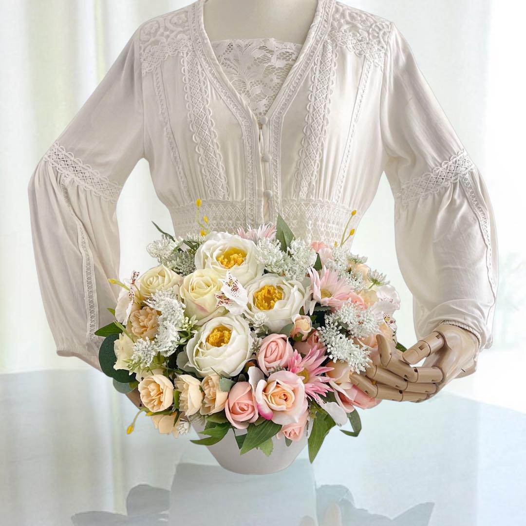 咲き誇るホワイト&ピンクのバラを中心に、可憐なデイジーやレースフラワー、そして上品なシンビジウムの花々を組み合わせ、柔らかな光の中でふんわりと咲き香るような雰囲気に仕上げました。