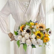 落ち着いたアースホワイトのダリアやホワイトローズが、明るさの中に品のあるやさしさをプラス。