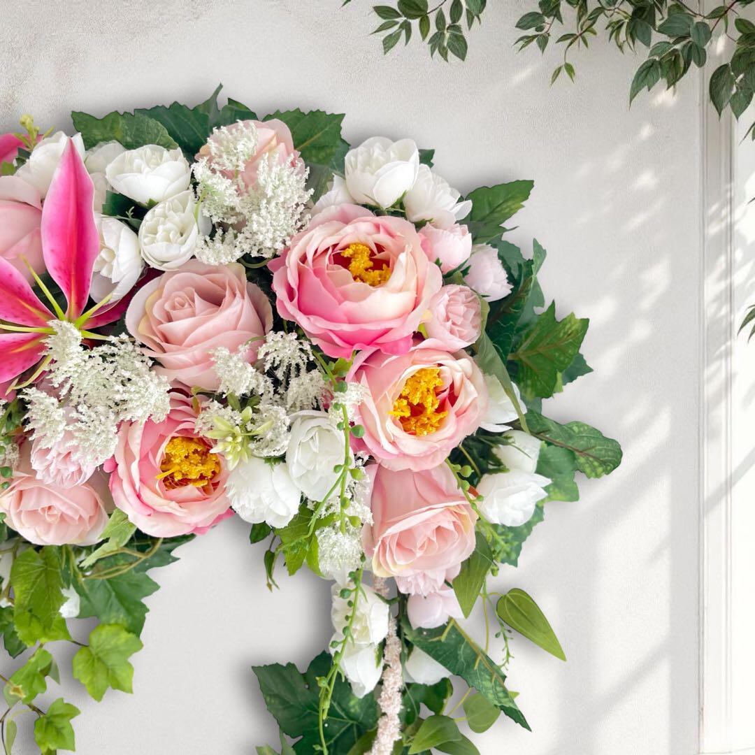 見上げた瞬間に微笑みが生まれるような、心ときめくフラワーアーチリースです。