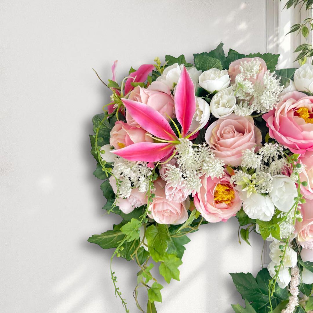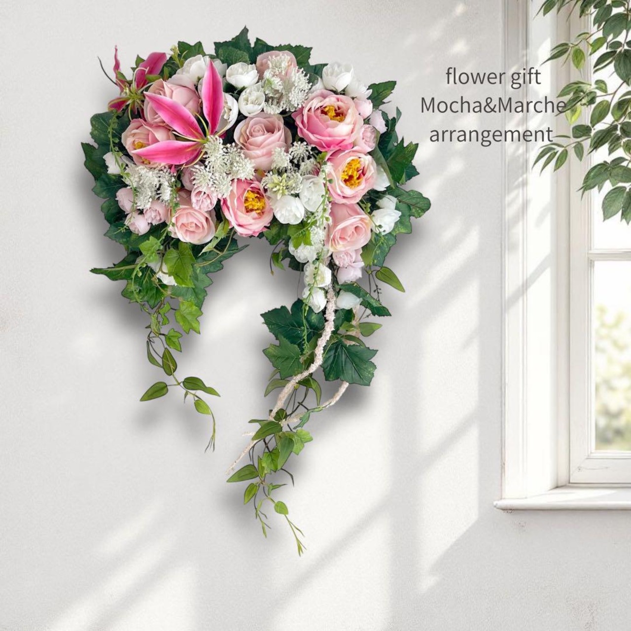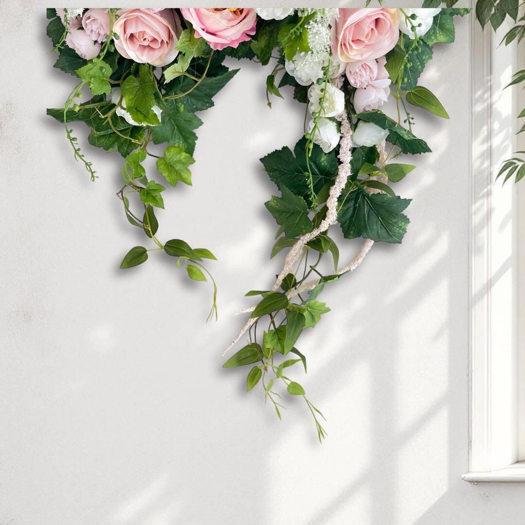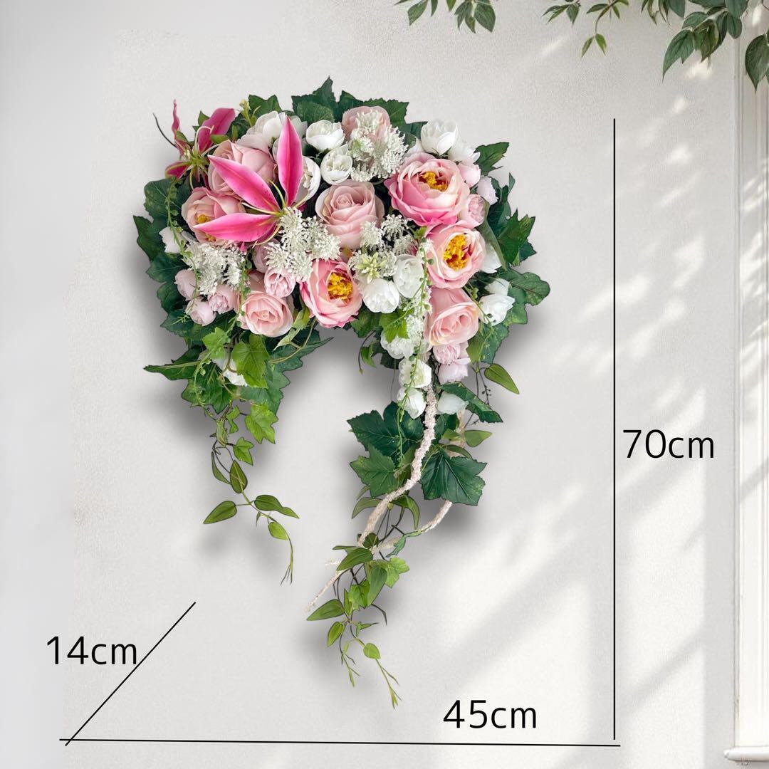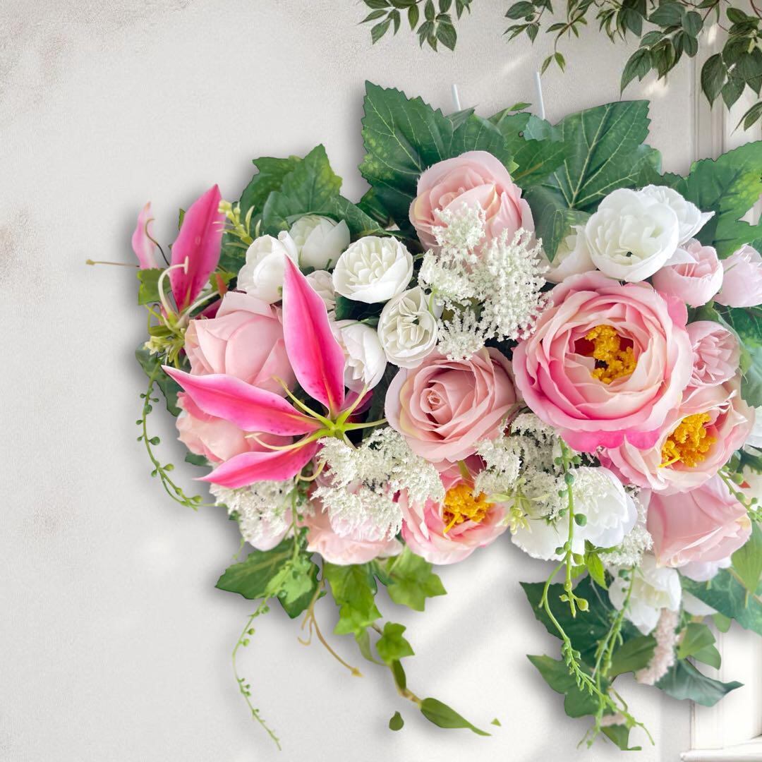 ブロッサムリース アーチ型フラワーリース ピンクの薔薇のリース 光触媒フラワー アーティフィシャルフラワー