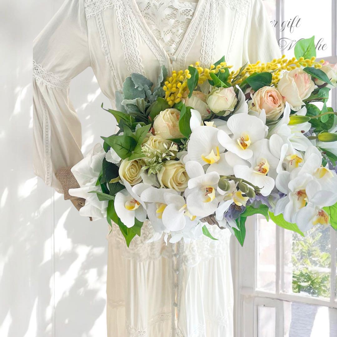 優しいクリーム色のユリに、ふわりと重ねたミモザやコスモス、アジサイ…。