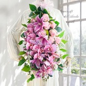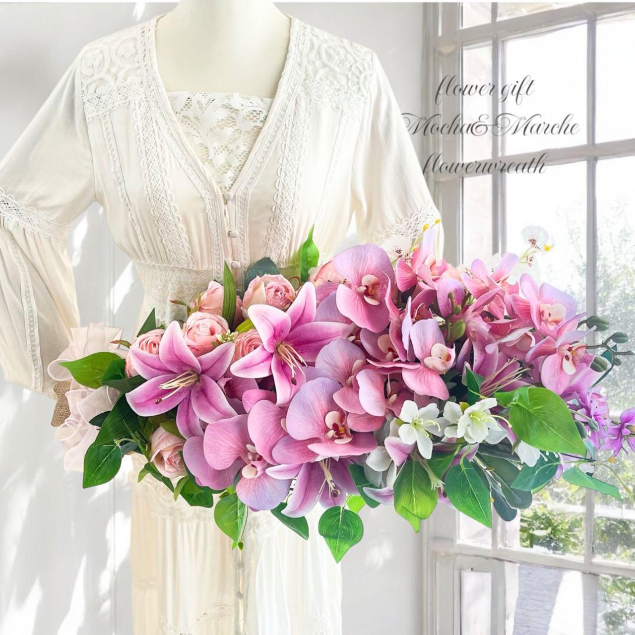 そして可憐なクレマチスとシンビジウムが、重なり合うように咲く姿が美しい特大の花束スワッグです!