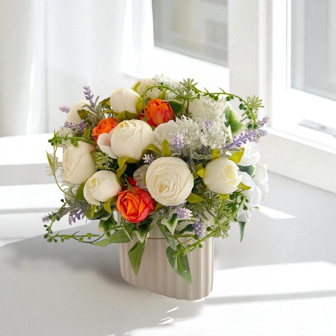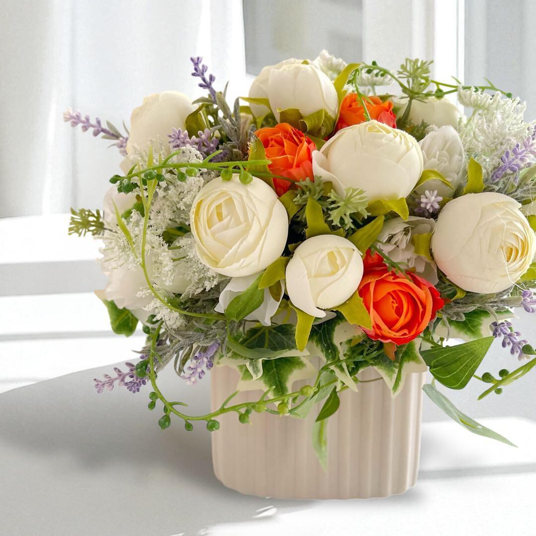 癒しと元気を届けるホワイト&オレンジのアレンジメント(光触媒加工)敬老の日ギフト 誕生日プレゼント