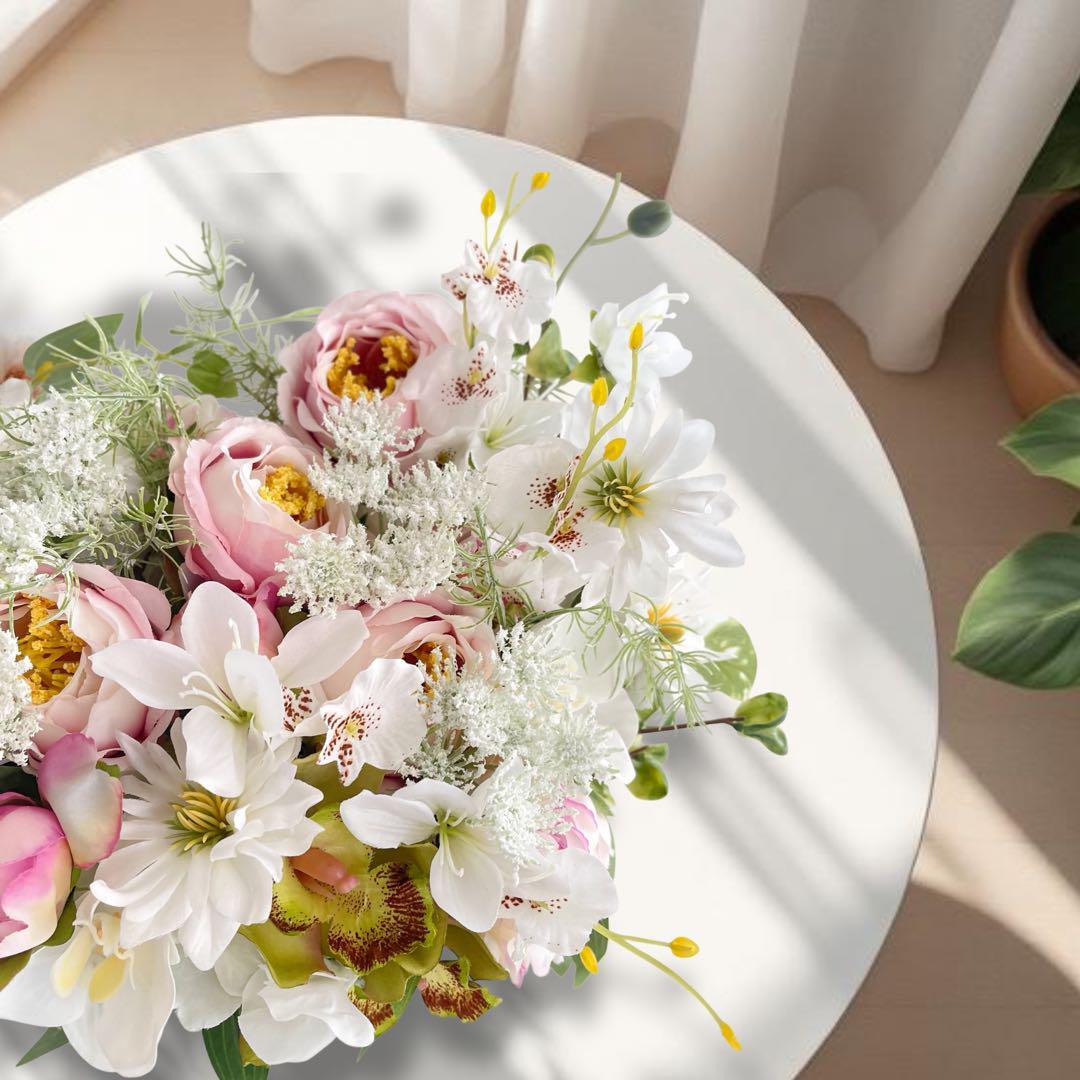 ふわりと咲きこぼれるボタンローズ、気品あふれるシンビジウム、華やかさを添えるダリアやシャクヤク──