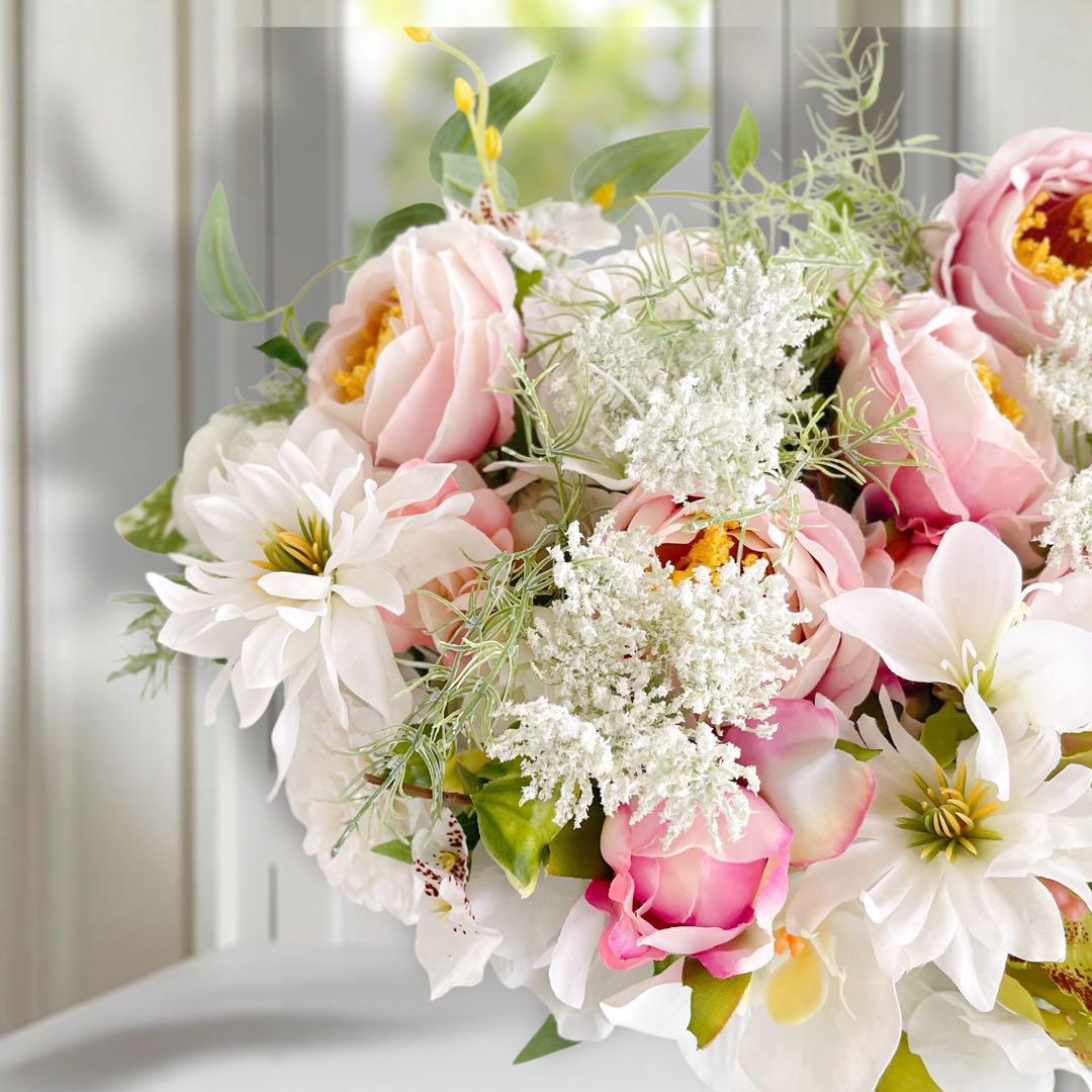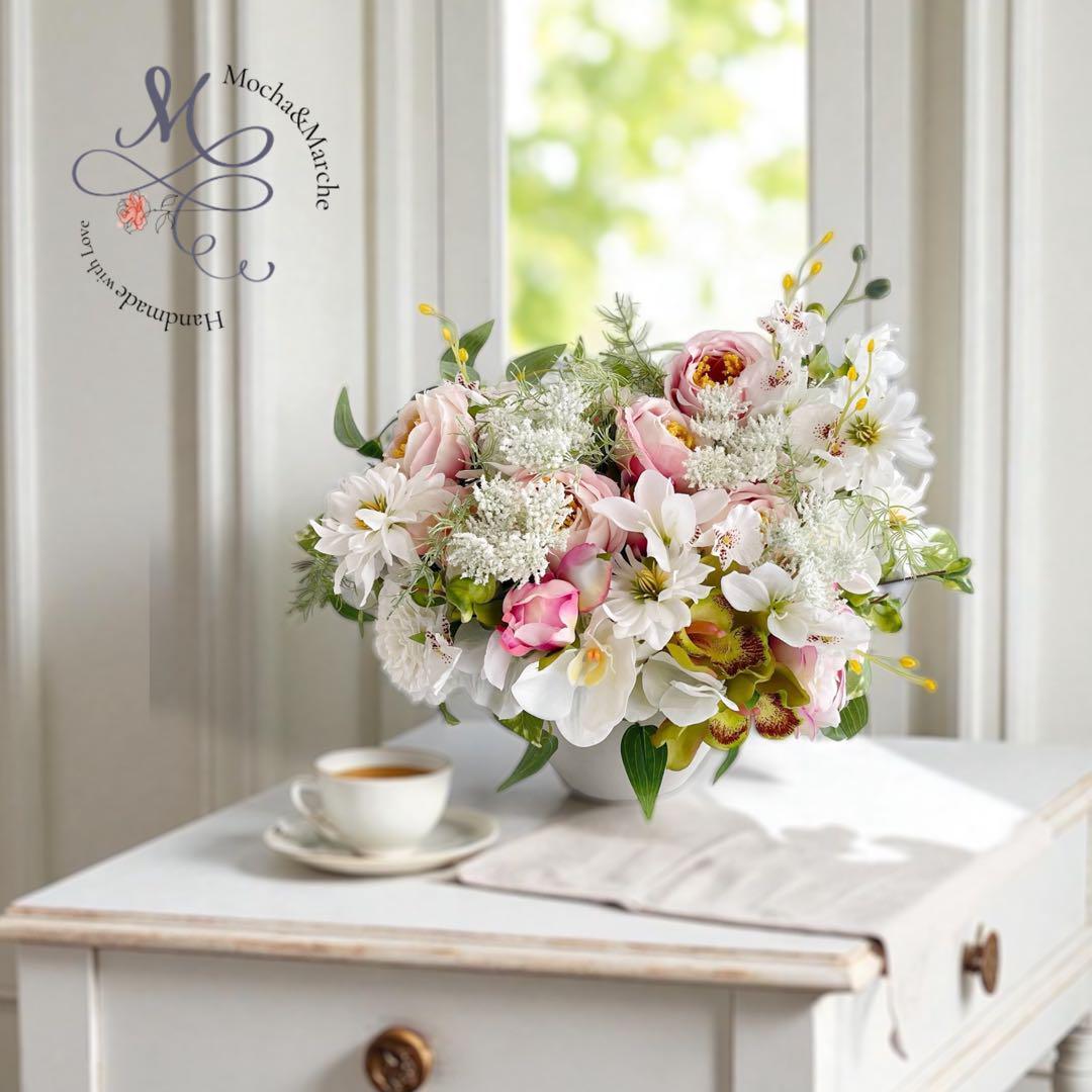 ピンクとホワイトを基調に、カップローズやデンドロビウム、レースフラワー、スイートピーなどをたっぷりとあしらい、見るたび心がほどけるような彩りを添えました。