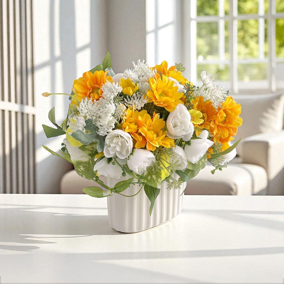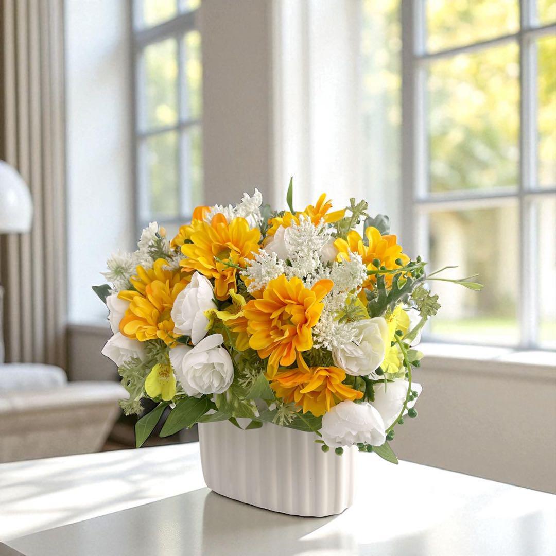 太陽のような明るさを持つイエローと、清楚で優しいホワイトローズのコントラストが、空間を一気に明るく彩ります。