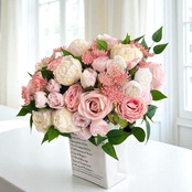 柔らかなピンクとホワイトのローズをたっぷりとあしらった、心ときめくギフトアレンジメントです。