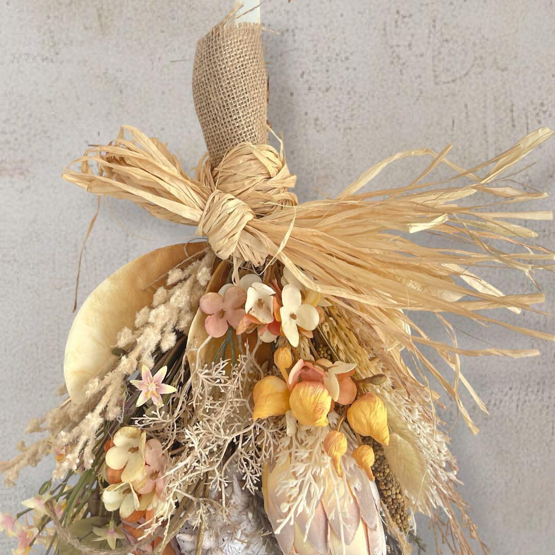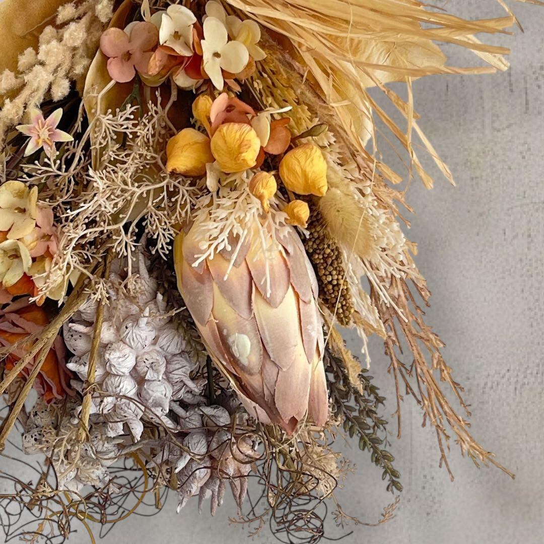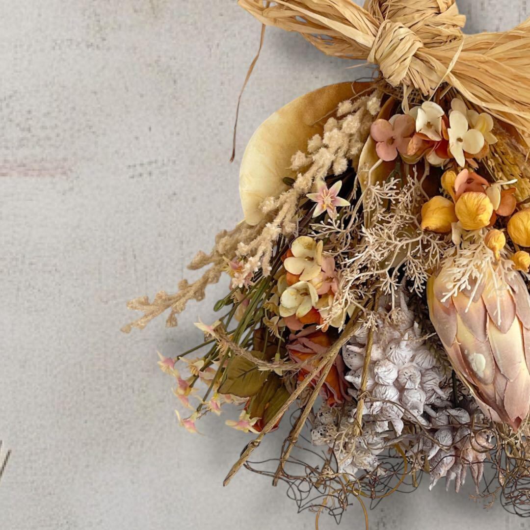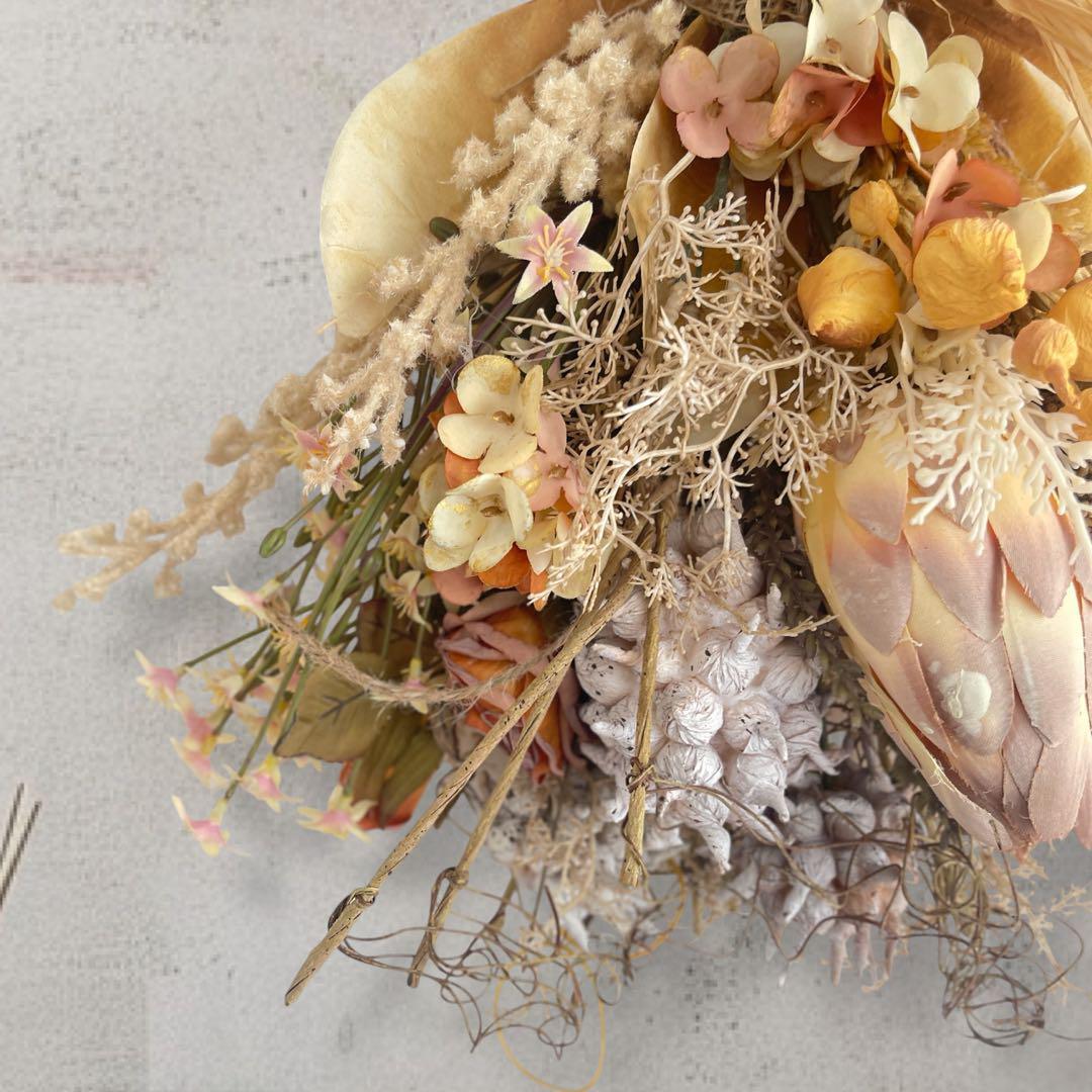 ドライのローズや木の実、バンクシアなどを豪華に組み合わせ、ラフィアでふんわりと結び仕上げました。