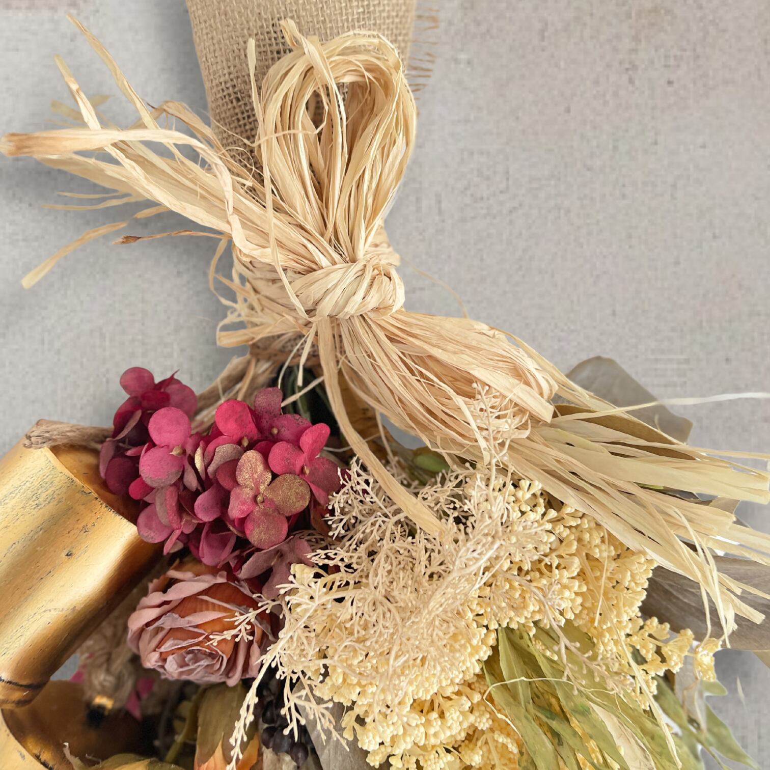 ドライフラワーのような自然な風合いを、アーティフィシャルフラワーで丁寧に再現したナチュラルスワッグです。