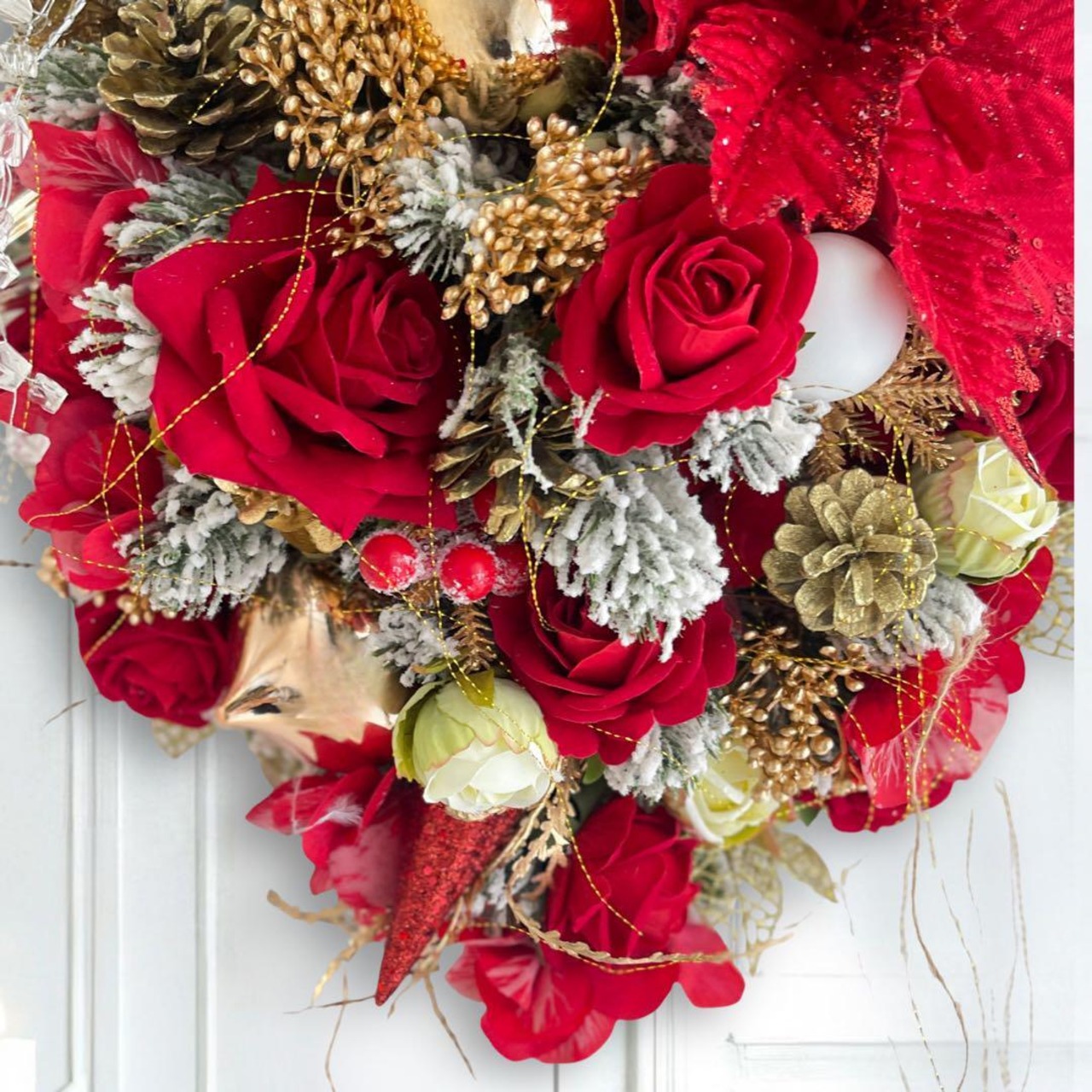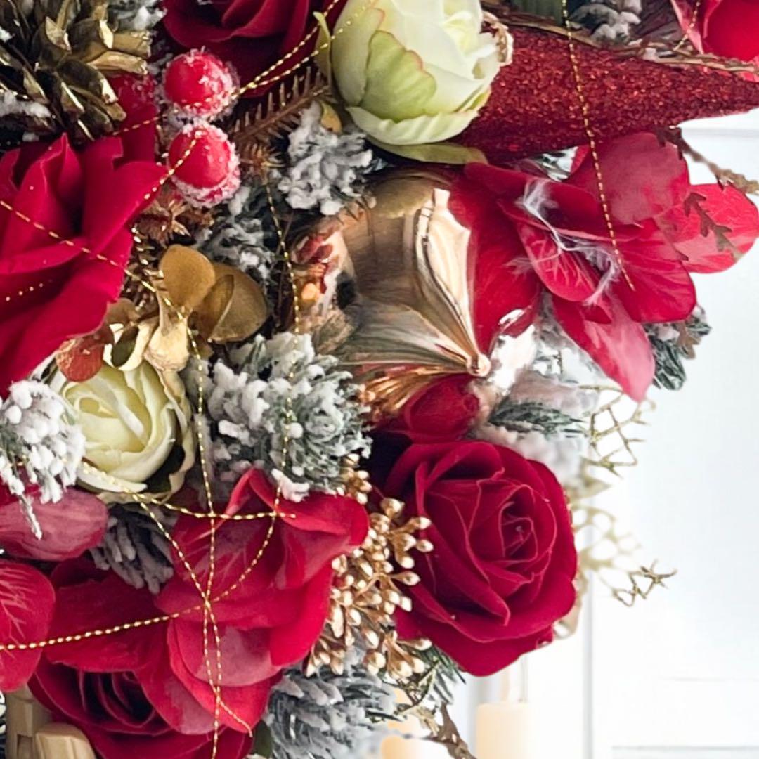 深みのあるレッドローズとゴールドのアクセントが織りなす、まるで“クリスマスの女王”のような圧倒的な存在感が魅力的なツリー型のクリスマスリースです。