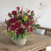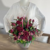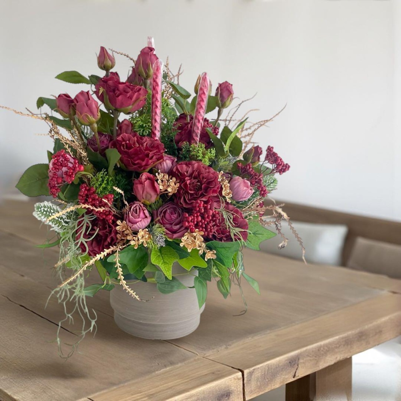 深みのあるボルドーの花々と、優しく輝くキャンドルが織りなすクラシカルなフラワーアレンジメント。