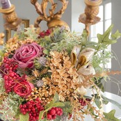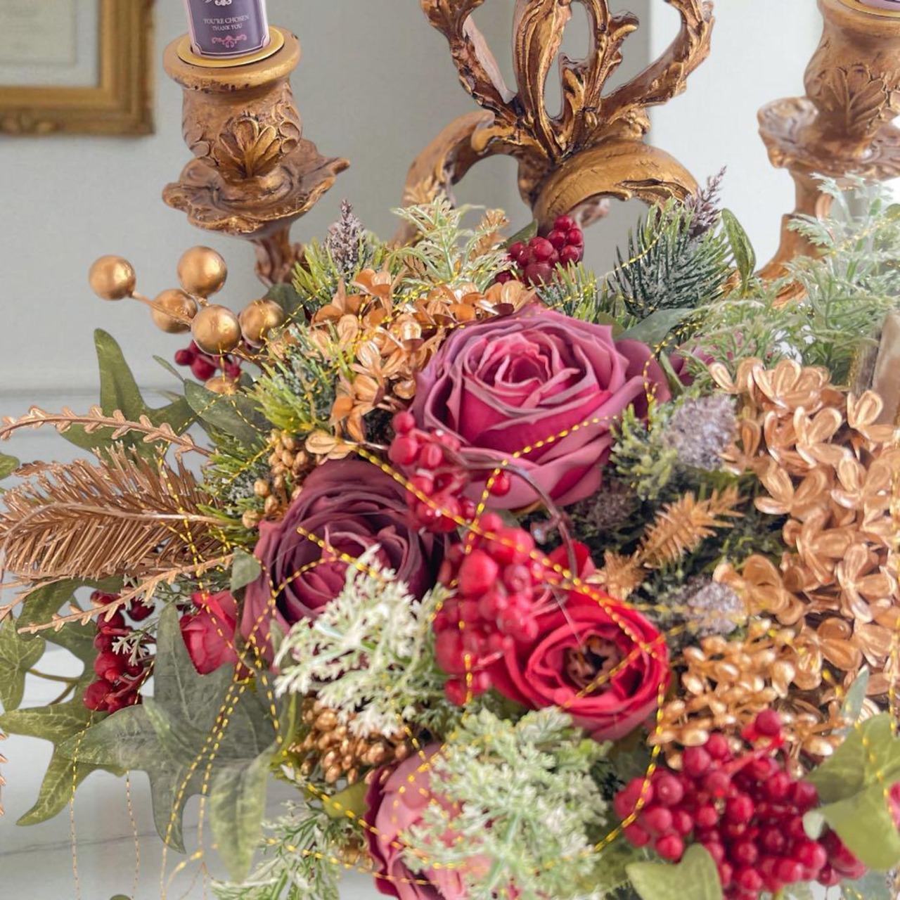 アンティーク調のゴールドキャンドルスタンドに、深紅のローズとベリーレッドの実物、ゴールドリーフを贅沢にあしらったテーブルフラワーをセットにしました。