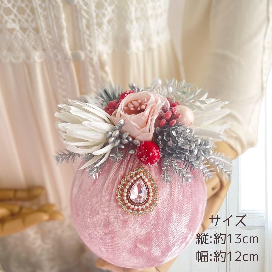 ピンクのベルベットに包まれたまんまるのフォルムに、繊細なローズやベリー、雪をまとったようなシルバーグリーンが華やかに彩られています。