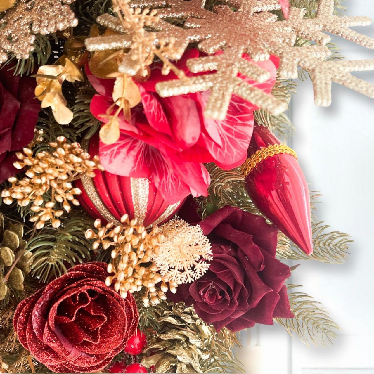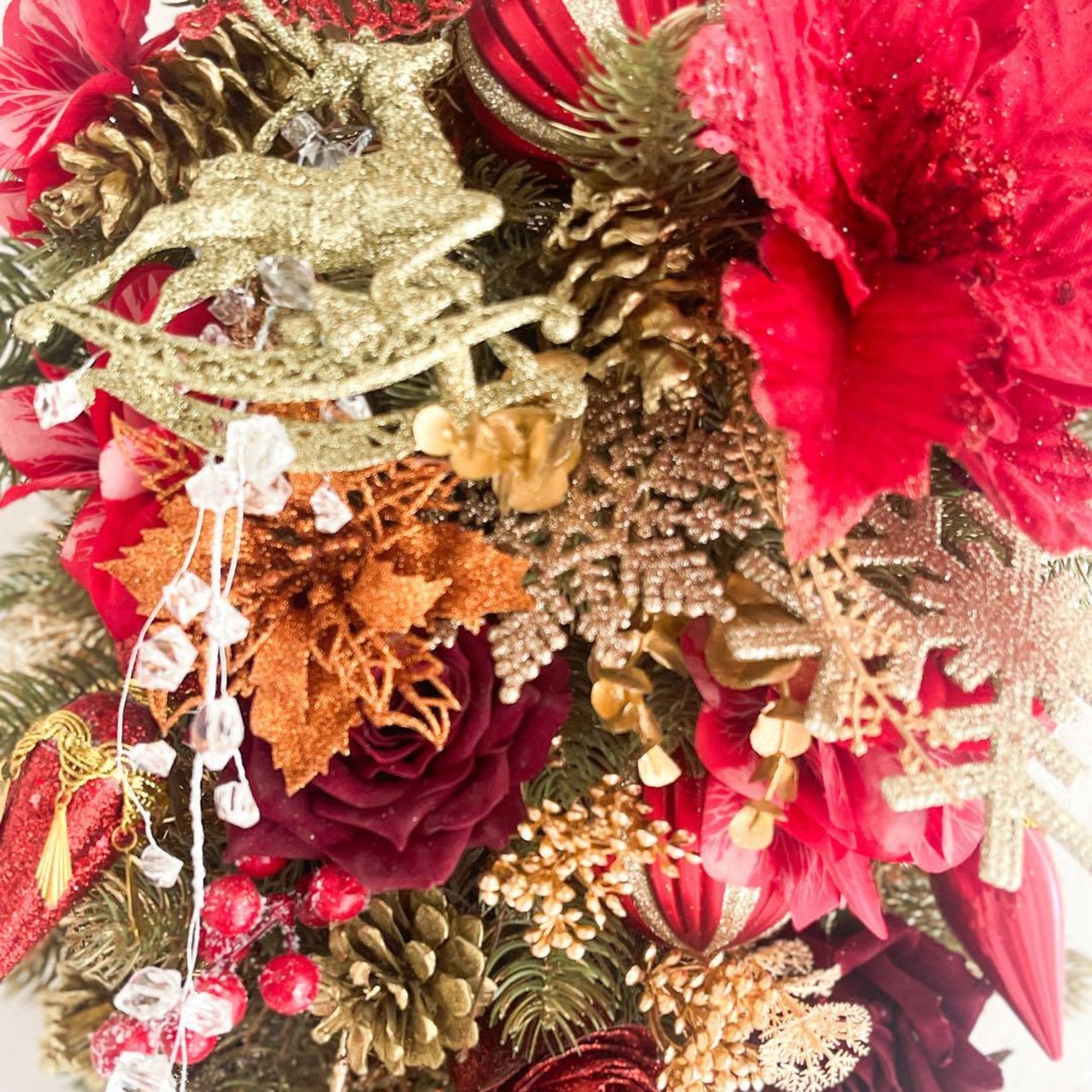 一つ一つ丁寧に配置されたオーナメントや、高級アーティフィシャルフラワーならではの繊細な質感が、一年を締めくくる特別な季節をより豊かに彩ります。