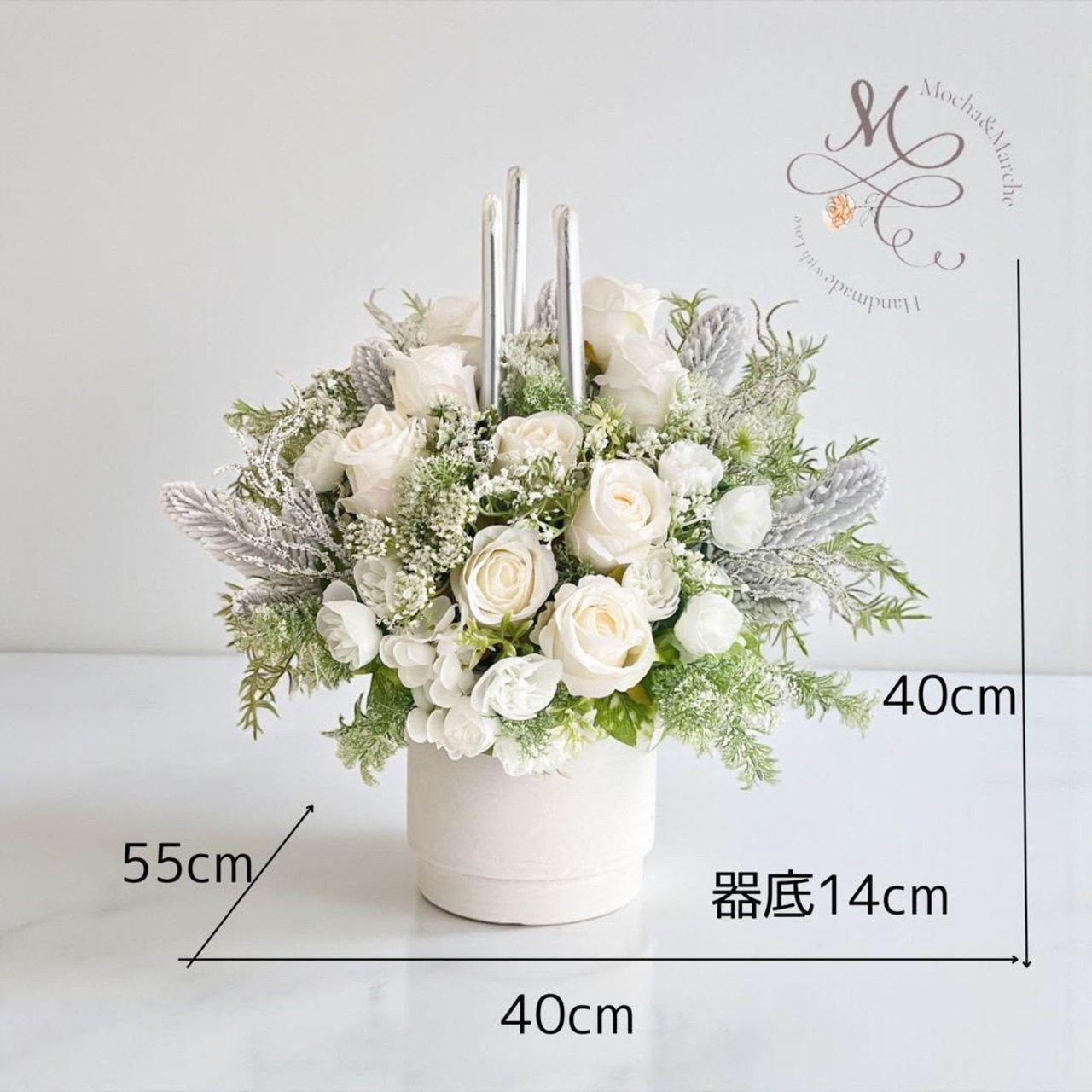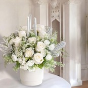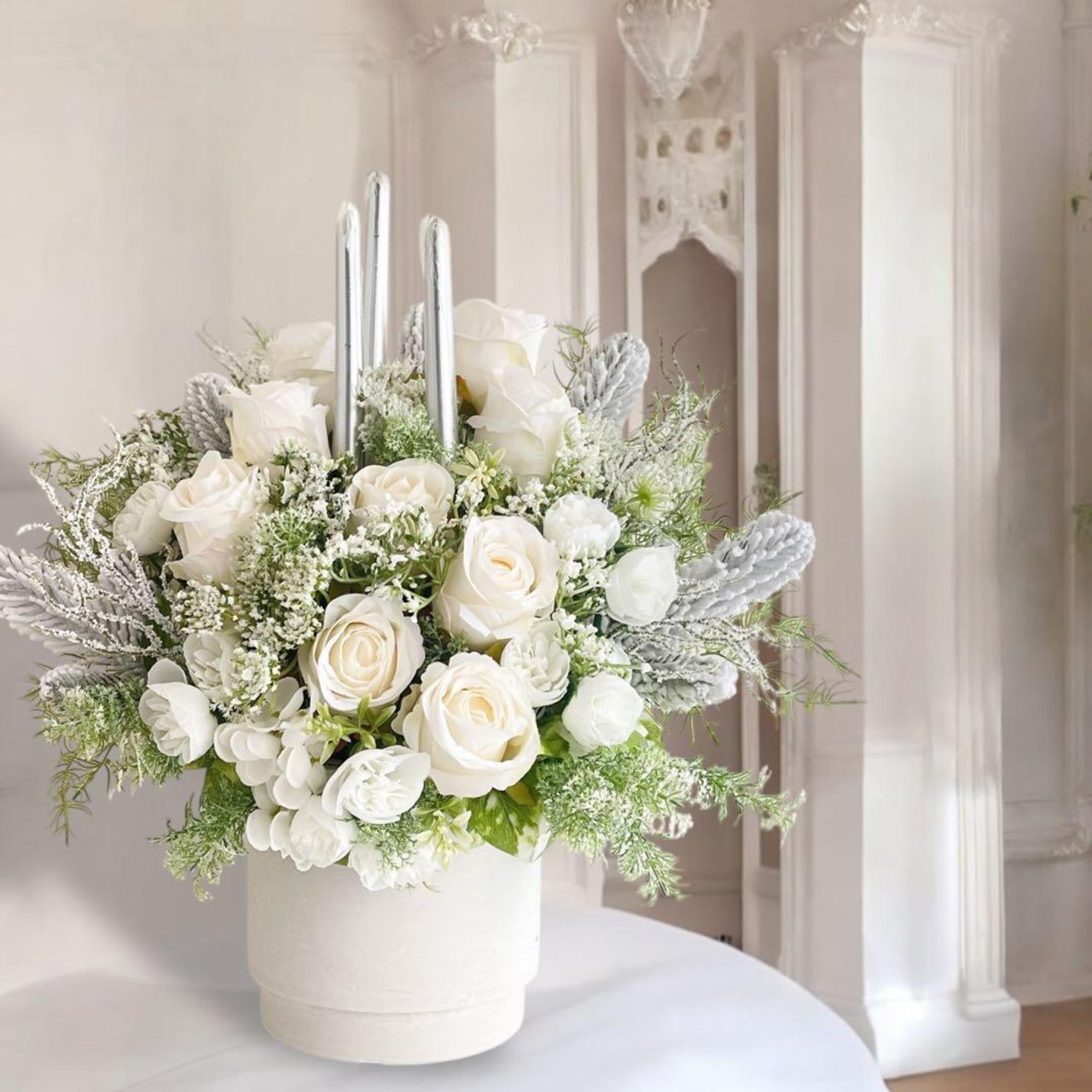 シルバーキャンドルを中心に、白いローズが重なり合い、まるで雪の結晶が静かに舞い降りた瞬間を切り取ったような、透明感あふれるデザインです。