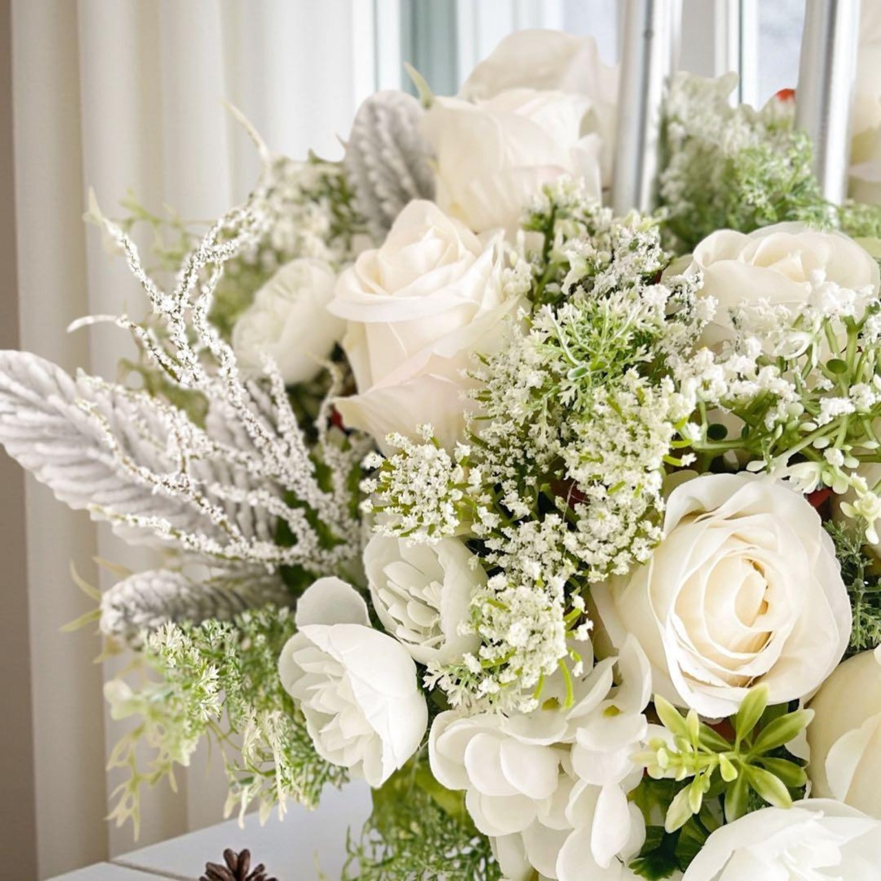 光を柔らかく反射するホワイトスノーリーフやフェザーグリーンが、純白の花々の間から静かに煌めき、凛とした冬の美しさを演出します。